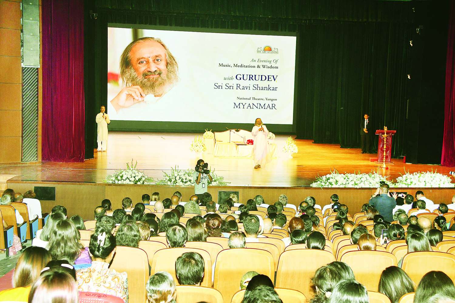 မွန်းလွဲပိုင်းတွင် ဂုရုကြီး Sri Sri Shankar သည် အမျိုးသား ဇာတ်ရုံ၌ကျင်းပသည့် တရားကျင့်စဉ်နှင့် အသိဉာဏ်ပွင့်လင်းမှုဆိုင်ရာ အခမ်းအနားသို့တက်ရောက်၍ နှုတ်ခွန်းဆက်စကားပြောကြားပြီး ရန်ကုန်တိုင်းဒေသကြီးဝန်ကြီးချုပ် ဦးစိုးသိန်း၊ အိန္ဒိယသံအမတ်ကြီး H.E. Mr. Abhay Thakur ၊ နီပေါသံအမတ်ကြီး H.E.Mr Harish-chandra Ghimire ၊ ကမ္ဘောဒီးယားသံအမတ်ကြီး H.E CHENG Manith နှင့် သီရိလင်္ကာသံအမတ်ကြီး H.E. Mrs Prabashini Ponnaperuma တို့နှင့်အတူ ဆီမီးထွန်းညှိပူဇော်သည်။