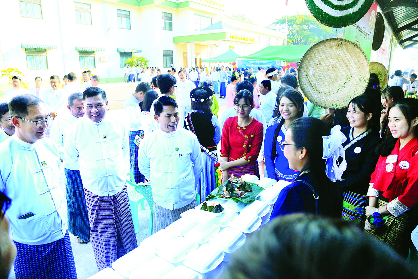 ဦးစွာ ပြည်ထောင်စုဝန်ကြီးများက စျေးရောင်းပွဲတော်ရှိ တက္ကသိုလ်များမှ တိုင်းရင်းသားစာပေနှင့် ယဉ်ကျေးမှုဆပ်ကော်မတီများ၏ တိုင်းရင်းသားရိုးရာ အစားအစာများ ရောင်းချနေမှုကို လှည့်လည်ကြည့်ရှု အားပေးကြသည်။