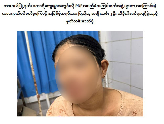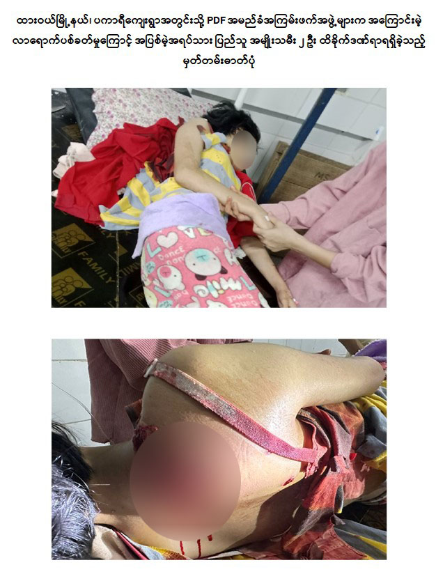 တနင်္သာရီတိုင်းဒေသကြီး၊ ထားဝယ်မြို့နယ်၊ ပကာရီကျေးရွာအတွင်းသို့ PDF အမည်ခံအကြမ်းဖက်သမားများက လက်လုပ်စိန်ပြောင်းဖြင့် အကြောင်းမဲ့လာရောက်ပစ်ခတ်ခဲ့မှုကြောင့် အပြစ်မဲ့အရပ်သားပြည်သူ အမျိုးသမီး ၂ ဦး ထိခိုက်ဒဏ်ရာများ ရရှိခဲ့ကြောင်း သိရှိရသည်။