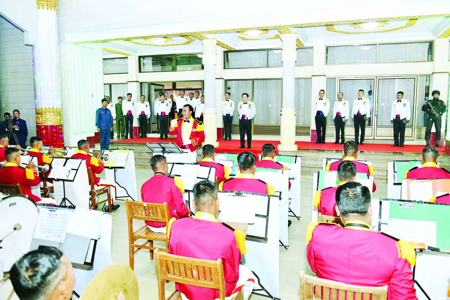 ယင်းနောက် နိုင်ငံတော်စီမံအုပ်ချုပ်ရေးကောင်စီဥက္ကဋ္ဌ တပ်မတော်ကာကွယ်ရေးဦးစီးချုပ်နှင့် အဖွဲ့ဝင်များသည် သင်တန်းဆင်းအရာရှိများနှင့်အတူ ပြည်သူ့ဆက်ဆံရေးနှင့် စိတ်ဓာတ်စစ်ဆင်ရေးညွှန်ကြားရေးမှူးရုံး ကွပ်ကဲမှုအောက် နယ်လှည့်ပြည်သူ့ဆက်ဆံရေးအဖွဲ့၏ တေးသီချင်းများဖြင့် ဂုဏ်ပြုဖျော်ဖြေတင်ဆက်မှုများအား ကြည့်ရှုအားပေးခဲ့ကြကြောင်း သတင်းရရှိသည်။