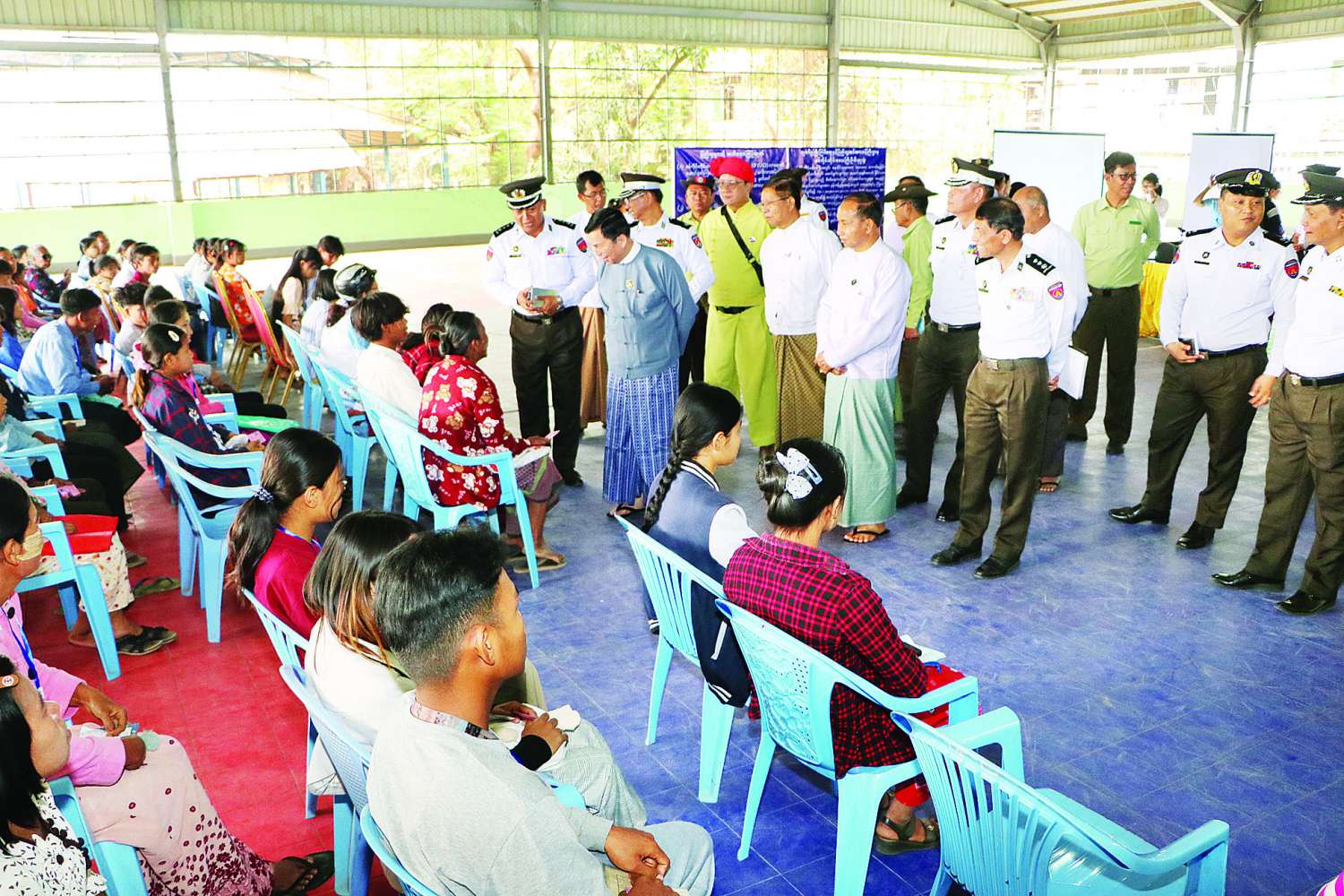 ယင်းနောက် ပြည်ထောင်စုဝန်ကြီးနှင့် တိုင်းဒေသကြီးဝန်ကြီးချုပ်တို့သည် မုံရွာမြို့ ပြည်သူ့အားကစားကွင်း ဖူဆယ်အားကစားရုံ၌ လူဝင်မှုကြီးကြပ်ရေးနှင့် ပြည်သူ့အင်အားဝန်ကြီးဌာနမုံရွာ မြို့နယ်ဦးစီးမှူးရုံးမှ ဝန်ထမ်းများက ဒေသခံပြည်သူများအား ပန်းခင်းစီမံချက်အဆင့်(၃)ဖြင့် အိမ်ထောင်စုလူဦးရေစာရင်းနှင့် နိုင်ငံသားစိစစ်ရေးကတ်ပြားထုတ်ပေးရေး လုပ်ငန်းကွင်းဆင်းဆောင်ရွက်နေမှုနှင့် နိုင်ငံသားကတ်ပြားရရှိပြီးသူများအား e-ID စနစ်ဖြင့် Biographic/Biometric ကောက်ယူကာ Unique ID နံပါတ် ထုတ်ပေးခြင်းလုပ်ငန်း One Stop Service ဖြင့် ဆောင်ရွက်ပေးနေမှုကို ကြည့်ရှုအားပေးပြီး လိုအပ်သည်များကို ညှိနှိုင်းဆောင်ရွက်ပေးသည်။