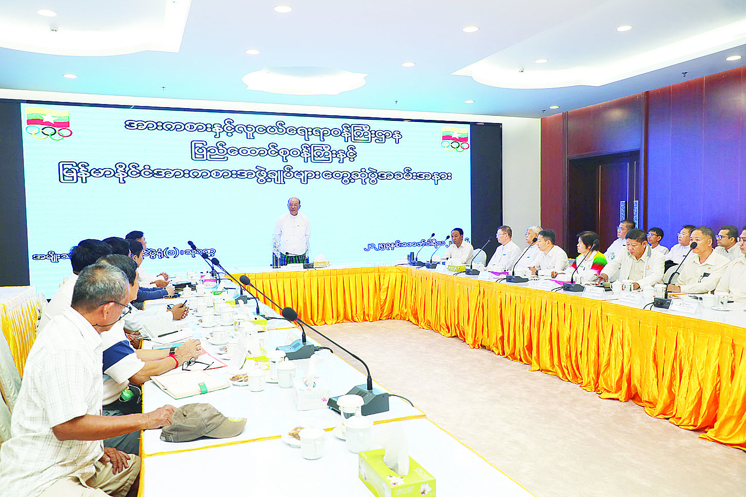 (၃၃)ကြိမ်မြောက် အရှေ့တောင်အာရှအားကစားပြိုင်ပွဲတွင် ဝင်ရောက်ယှဉ်ပြိုင်ပြီး အောင်မြင်မှုများ ရရှိစေရေးအတွက် သက်ဆိုင်ရာအားကစားအဖွဲ့ချုပ်ဥက္ကဋ္ဌများနှင့်တွေ့ဆုံပွဲကို ယနေ့နံနက် ၉ နာရီခွဲတွင် ရန်ကုန်မြို့အမျိုးသားအားကစားပြိုင်ပွဲရုံ(၁) ပတ္တမြားခန်းမ၌ ကျင်းပသည်။