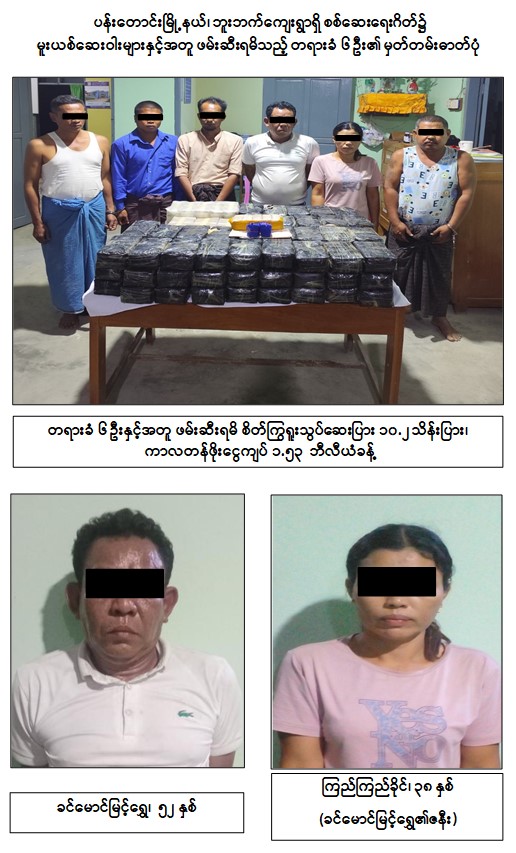 သို့ဖြစ်၍ တရားခံများအား ဥပဒေအရ ထိရောက်စွာအရေးယူနိုင်ရေး ဆက်လက်ဆောင်ရွက်သွားမည်ဖြစ်ကြောင်းနှင့် တရားခံပြေး ကျော်လင်းနှင့် စိုင်းကျော်လှတို့အပါအဝင် ဆက်စပ်တရားခံများအား ဖော်ထုတ်ဖမ်းဆီးရမိရေး ဆက်လက်ဆောင်ရွက်လျက်ရှိကြောင်းနှင့် မူးယစ်ဆေးဝါးသယ်ဆောင်သည့် သတင်းများရရှိပါက သက်ဆိုင်ရာသို့ လျှို့ဝှက်စွာ သတင်းပေးတိုင်ကြားနိုင်ပါကြောင်း၊ သတင်းပေးသူနှင့် ပူးပေါင်းပါဝင်ဖမ်းဆီးပေးသူများအား ထိုက်တန်စွာ လျှို့ဝှက်၍ ဆုငွေများချီးမြှင့်ပေးမည်ဖြစ်ကြောင်း အသိပေးသတင်းထုတ်ပြန်အပ်သည်။