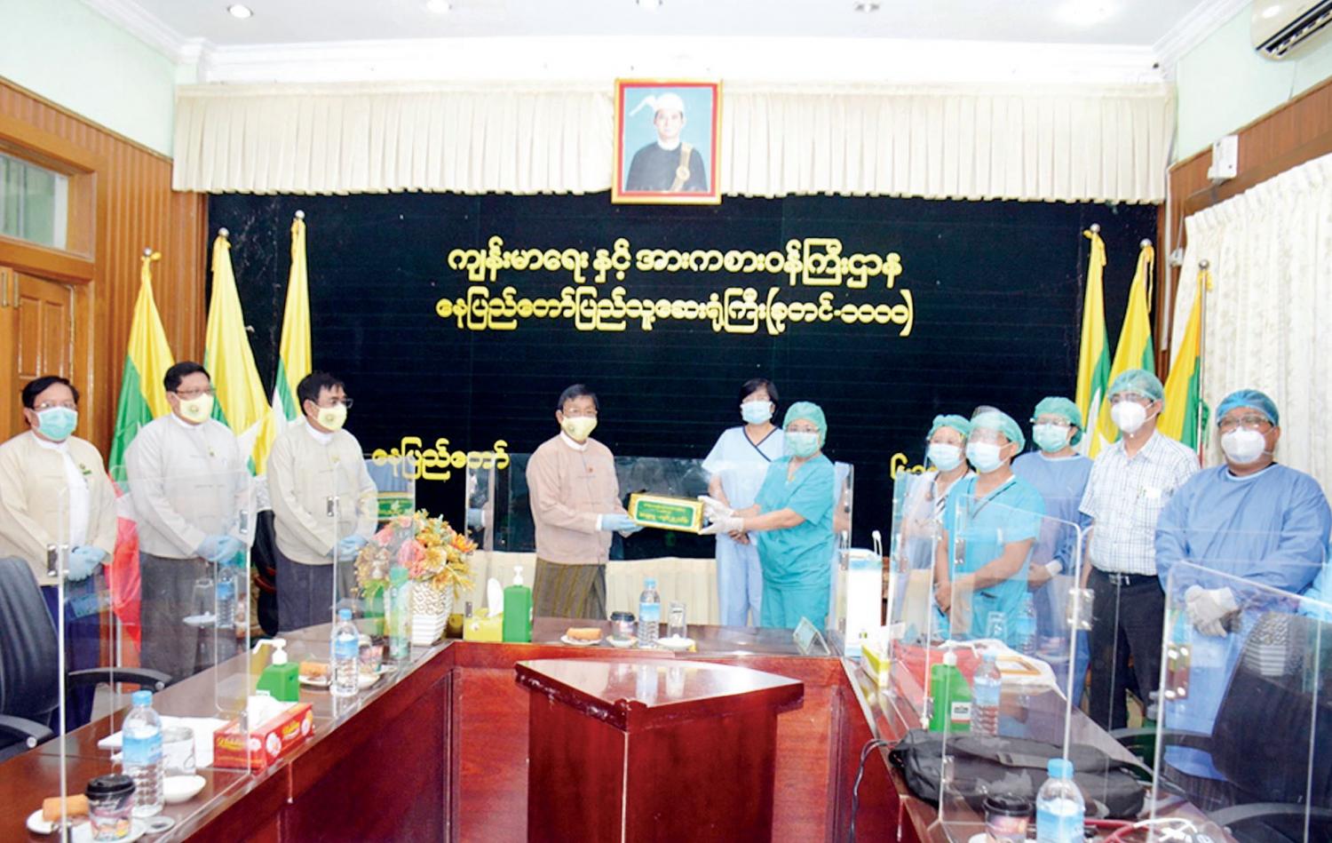 ထို့နောက်  စိုက်ပျိုးရေး၊ မွေးမြူရေးနှင့်     ဆည်မြောင်းဝန်ကြီးဌာန     ပြည်ထောင်စုဝန်ကြီးနှင့်     ဒုတိယဝန်ကြီး တို့အမှူးပြုသော     ဝန်ကြီးဌာန အောက်ရှိ ဦးစီးဌာနများ၊ တက္ကသိုလ်များမှ  နိုင်ငံဝန်ထမ်းများ စုပေါင်း ထည့်ဝင် လှူဒါန်းသည့်     အလှူငွေကျပ် ၂၉၂၀၀၀၀ဝ ကို   ဝန်ကြီးဌာန ဝန်ထမ်း မိသားစုများကိုယ်စား      ဒုတိယဝန်ကြီးက    ပေးအပ်လှူဒါန်းရာ နေပြည်တော်   ပြည်သူ့ ဆေးရုံကြီး (ခုတင်-၁၀၀၀) မှ တာဝန်ရှိသူများ က   လက်ခံရယူ၍  ဂုဏ်ပြုမှတ်တမ်းလွှာ ပြန်လည်ပေးအပ်ကာ ကျေးဇူးတင်စကား ပြောကြားသည်။