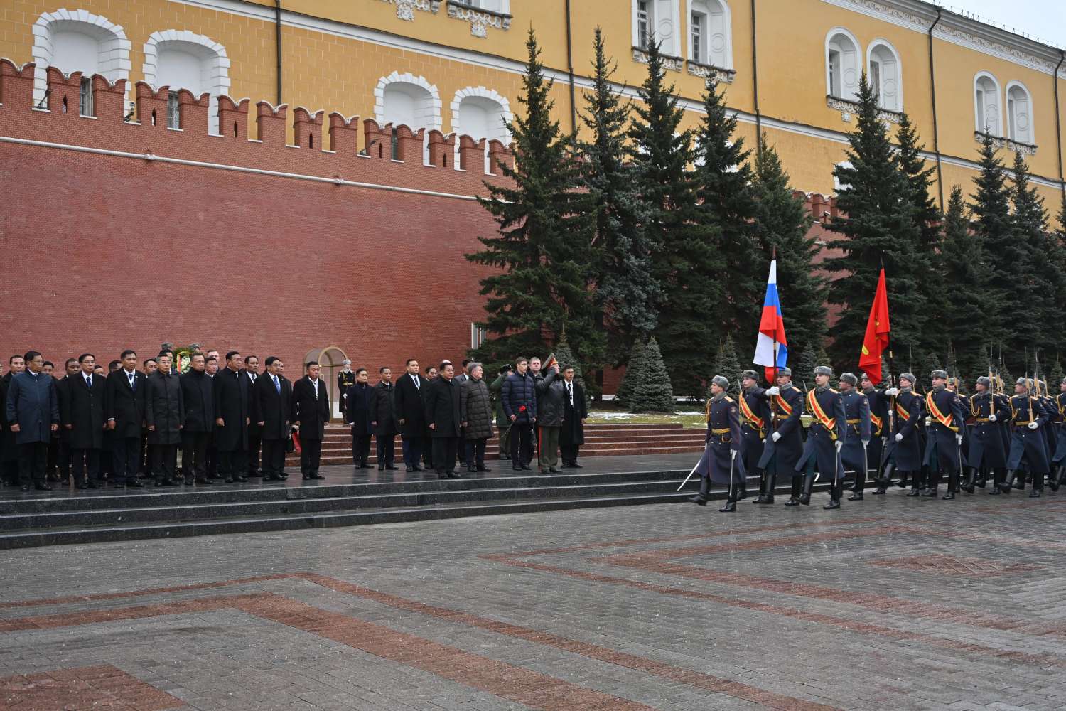 ထို့နောက် နိုင်ငံတော်စီမံအုပ်ချုပ်ရေးကောင်စီဥက္ကဋ္ဌ နိုင်ငံတော်ဝန်ကြီးချုပ်သည် ဂုဏ်ပြုတပ်ဖွဲ့၏ ချီတက်အလေးပြုခြင်းကိုခံယူပြီး တာဝန်ရှိသူများကိုရင်းရင်းနှီးနှီး နှုတ်ဆက်သည်။ ထိုသို့နှုတ်ဆက်စဉ် ရုရှားဖက်ဒရေးရှင်းနိုင်ငံဂုဏ်ပြုတပ်ဖွဲ့က မြန်မာ့တပ်မတော်စစ်သီချင်းများဖြင့် ဂုဏ်ပြုတီးမှုတ်ခဲ့ကြောင်း သတင်းရရှိသည်။