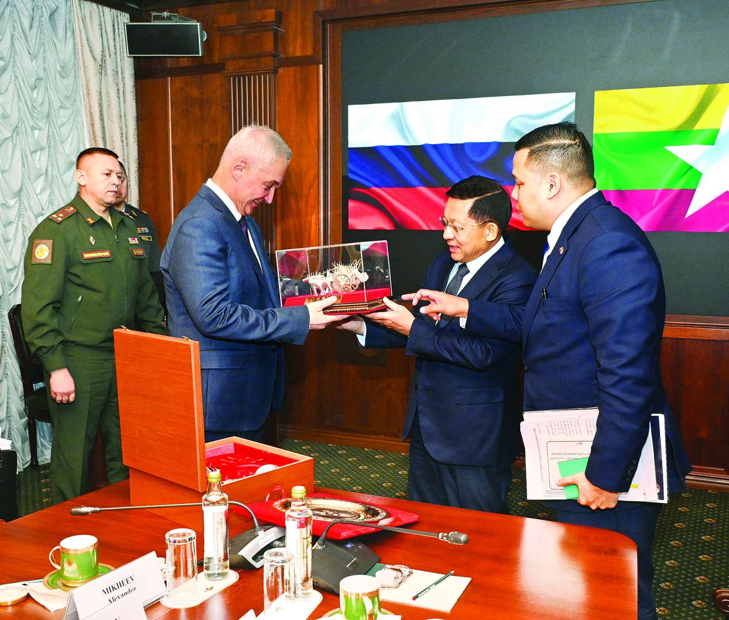 တွေ့ဆုံပွဲအပြီးတွင် နိုင်ငံတော်စီမံအုပ်ချုပ်ရေးကောင်စီဥက္ကဋ္ဌ နိုင်ငံတော်ဝန်ကြီးချုပ်နှင့် ရုရှားဖက်ဒရေးရှင်းနိုင်ငံ ကာကွယ်ရေးဝန်ကြီးတို့သည် အမှတ်တရလက်ဆောင်ပစ္စည်းများ အပြန်အလှန်ပေးအပ်ပြီး စုပေါင်းမှတ်တမ်းတင် ဓာတ်ပုံရိုက်ခဲ့ကြကြောင်း သတင်းရရှိသည်။