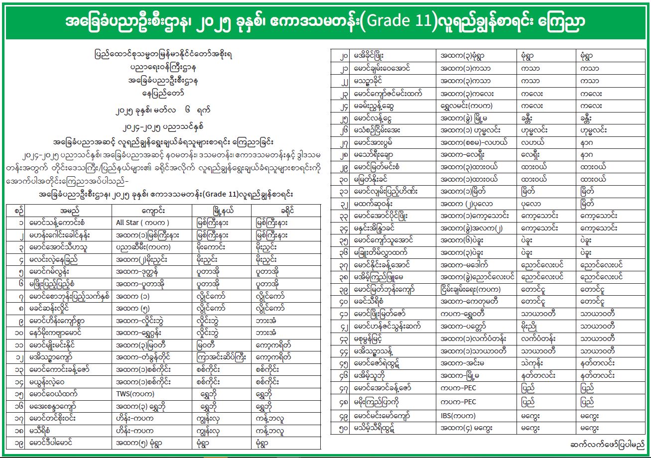 အခြေခံပညာဦးစီးဌာန၊ ၂၀၂၅ ခုနှစ်၊ ဧကာဒသမတန်း(Grade 11) လူရည်ချွန်စာရင်းကြေညာ