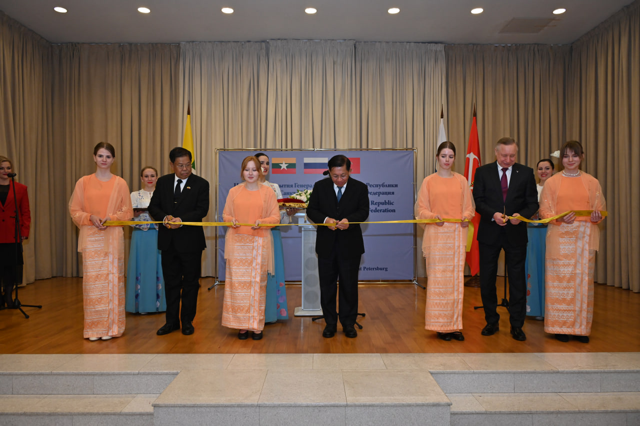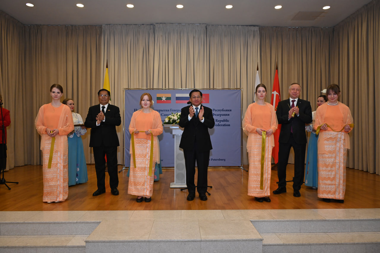 ရုရှားဖက်ဒရေးရှင်းနိုင်ငံ၊ စိန့်ပီတာစဘတ်မြို့၊ ကောင်စစ်ဝန်ချုပ်ရုံးဖွင့်ပွဲ အခမ်းအနားကို မတ်လ ၅ ရက်နေ့ ဒေသစံတော်ချိန် ညနေပိုင်းတွင် စိန့်ပီတာစဘတ်အစိုးရဧည့်ဂေဟာ K2 ၌ ကျင်းပပြုလုပ်ရာ ရုရှားနိုင်ငံသို့ တရားဝင်ချစ်ကြည်ရေးခရီးရောက်ရှိနေသည့် နိုင်ငံတော်စီမံအုပ်ချုပ်ရေးကောင်စီဥက္ကဋ္ဌ နိုင်ငံတော်ဝန်ကြီးချုပ် ဗိုလ်ချုပ်မှူးကြီး မင်းအောင်လှိုင် တက်ရောက်ဖွင့်လှစ်ပေးသည်။