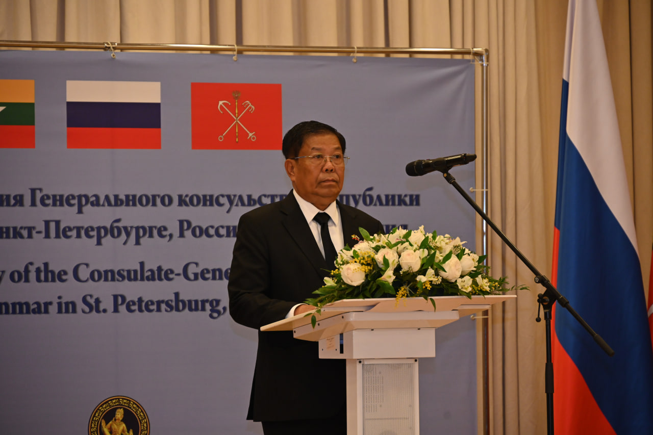 ထို့နောက် စိန့်ပီတာစဘတ်မြို့အုပ်ချုပ်ရေးမှူး မစ္စတာ အလက်ဇန္ဒားဘယ်ဂ်လော့က အဖွင့်နှုတ်ခွန်းဆက်စကားပြောကြားရာတွင် ရုရှား-မြန်မာဆက်ဆံရေးများ ကောင်းမွန်လျက်ရှိခြင်းကြောင့် မိမိတို့ရုရှားနိုင်ငံ စိန့်ပီတာစဘတ်မြို့တွင် မြန်မာကောင်စစ်ဝန်ချုပ်ရုံးကို ဖွင့်လှစ်နိုင်ခဲ့ခြင်းဖြစ်ကြောင်း၊ ယခုကဲ့သို့ ကောင်စစ်ဝန်ချုပ်ရုံးအား ဖွင့်လှစ်နိုင်ခဲ့ခြင်းကြောင့် နှစ်နိုင်ငံအကြားဆက်ဆံရေးကို ပိုမိုတိုးတက် ကောင်းမွန်လာစေမည်ဖြစ်ပါကြောင်း၊ မြန်မာကောင်စစ်ဝန်ချုပ်ရုံး ဖွင့်လှစ်နိုင်ရေးအတွက် အမြန်ဆုံးဆောင်ရွက်ပေးခဲ့သည့် နိုင်ငံတော်စီမံအုပ်ချုပ်ရေးကောင်စီဥက္ကဋ္ဌ နိုင်ငံတော်ဝန်ကြီးချုပ်ကိုလည်း ကျေးဇူးတင်ရှိပါကြောင်း၊ ရုရှား-မြန်မာနှစ်နိုင်ငံအကြား ကောင်စစ်ဝန်ချုပ်ရုံးသည် ပေါင်းကူးတံတားတစ်ခုသဖွယ်ဖြစ်သဖြင့် နှစ်နိုင်ငံအတွက် များစွာအကျိုးရှိပါကြောင်းဖြင့် ပြောကြားသည်။
