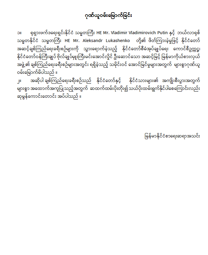 နိုင်ငံတော်စီမံအုပ်ချုပ်ရေးကောင်စီဥက္ကဋ္ဌ နိုင်ငံတော်ဝန်ကြီးချုပ် ဗိုလ်ချုပ်မှူးကြီး မင်းအောင်လှိုင်၏ ရုရှားဖက်ဒရေးရှင်းနိုင်ငံနှင့် ဘယ်လာရုစ်သမ္မတနိုင်ငံများသို့ သွားရောက်သည့် ချစ်ကြည်ရေးခရီးစဉ်များတွင် နိုင်ငံတော်အတွက် ကဏ္ဍစုံဖွံ့ဖြိုးတိုးတက်အောင် ကြိုးပမ်းဆောင်ရွက်ခဲ့မှုအပေါ် အဖွဲ့အစည်းများမှ ဂုဏ်ယူဝမ်းမြောက်ကြောင်း ထုတ်ပြန်ကြေညာ