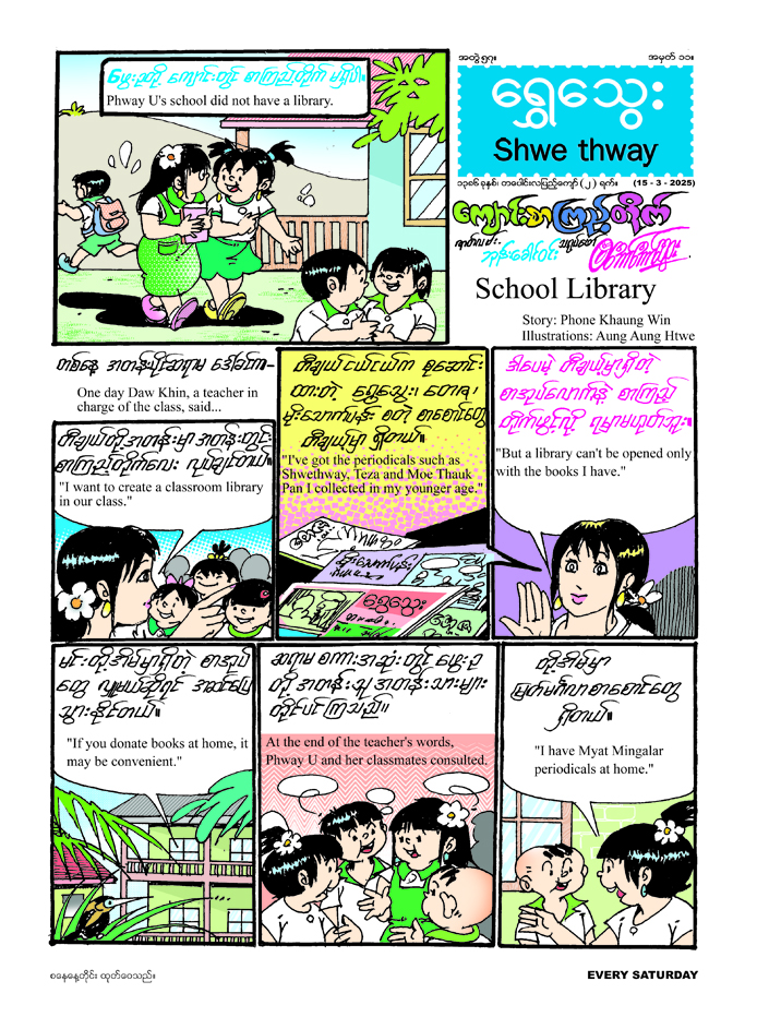 ၁၅ - ၃ - ၂၀၂၅ ရက် (စနေနေ့) တွင် ထွက်ရှိမည့် ရွှေသွေးဂျာနယ်အတွဲ (၅၇)၊ အမှတ် (၁၁) တွင် ဖွေးဥတို့အတန်းက စတင်လိုက်သော အတန်းတွင်း စာကြည့်တိုက်လေးမှ ကျောင်းစာကြည့်တိုက်အထိ တိုးတက်လာသောကြောင့် ကျောင်းသား ကျောင်းသူများ ဗဟုသုတရရှိကာ ပျော်ရွှင်နေကြပုံအကြောင်း သရုပ်ဖော်ထားသည့် “ကျောင်းစာကြည့်တိုက်” မျက်နှာဖုံးကာတွန်း၊ မျက်စိနာခြင်းကို ဖြစ်စေနိုင်သည့် နည်းလမ်းများနှင့် မျက်စိကျန်းမာရေးအတွက် သတိထားဆောင်ရွက်နိုင်မည့် နည်းလမ်းကောင်းများအကြောင်း တင်ဆက်ထားသည့် “မျက်စိနာခြင်း” သုတဆောင်းပါးကဏ္ဍ၊ ကလေးတို့ကိုယ်တိုင် ပါဝင်ဆောင်ရွက်နိုင်မည့် ဉာဏ်စမ်းကဏ္ဍ၊ ကြီးလာလျှင် မျက်စိအထူးကုဆရာဝန်ကြီး လုပ်မည်ဆိုသော ဂျိုးဂျိုးနှင့် ကျန်းမာရေးဗဟုသုတများအကြောင်း သရုပ်ဖော်ထားသည့် “ ကီးကီ၊ ဂျိုးဂျိုးနှင့်ကျန်းမာရေး” နှစ်မျက်နှာကာတွန်း၊ မီးဖြင့် ဆော့ကစားမိသဖြင့် ဒုက္ခရောက်ရသော ပေတူးတို့ သူငယ်ချင်းတစ်စုအကြောင်းကို ဖတ်ရှုရမည့် “မီးမပေါ့ဆရ၊ မဆော့ရ” ဝတ္ထုကဏ္ဍ၊ ဉာဏ်စမ်းမေးခွန်းများ၏ အဖြေကို အချက်ကျကျပြန်လည်အဖြေပေးနိုင်သော ချက်ပုအကြောင်း သရုပ်ဖော်ထားသည့် “ချက်ပု- ပေါင်းမယ်၊ နုတ်မယ်” တစ်မျက်နှာကာတွန်း၊ ကားအရုပ်မျိုးစုံဖြင့် ကစားမည်ဆိုသော ကလေးငယ်တစ်ယောက်အကြောင်းရေးဖွဲ့ထားသည့် ဆရာမန်းတင့်မော်၏ “သားနှင့် ကားရုပ်များ” ကဗျာကဏ္ဍအပါအဝင် အင်္ဂလိပ်စာကဏ္ဍ၊ ရွှေသွေးတို့လက်ရာကဏ္ဍ ကဏ္ဍစုံစုံလင်လင်ဖြင့် ထွက်ရှိပြီဖြစ်ရာ တစ်စောင်လျှင် ငွေကျပ် ၄၀၀ ဖြင့် စာပေဗိမာန်စာအုပ် အရောင်းဆိုင်များတွင် ဝယ်ယူနိုင်ကြောင်း သိရသည်။