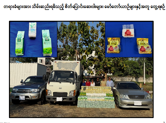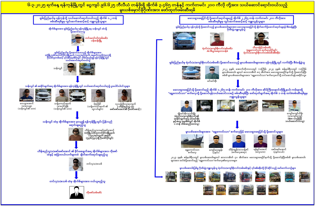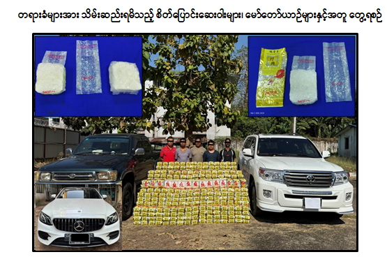 သတင်းကွင်းဆက်အရ မတ်လ ၆ ရက်နေ့ ည ၉ နာရီခွဲအချိန် မြောက်ဥက္ကလာပမြို့နယ်၊ (ဌ)ရပ်ကွက်၊ သုဓမ္မာလမ်းမကြီးတွင် ကျော်ကျော်သိန်း(ခ)ကျော်ကျော်(ခ)အသေးလေး မောင်းနှင်လာသည့် HYUNDAI BOX ယာဉ်ကိုရှာဖွေရာ ယာဉ်ပေါ်မှ အိုက်စ်(မက်သ်အဖက်တမင်း) ၁ ဒသမ ၂၆၅ တန်နှင့် ကက်တမင်း ၂၀၀ ကီလို ဖမ်းဆီးရမိခဲ့ကြောင်း၊ စစ်ဆေးဖော်ထုတ်ချက်အရ အဆိုပါစိတ်ပြောင်းဆေးဝါးများကို မလေးရှားပင်လယ်ရေပြင်သို့ ချိတ်ဆက်ပို့ဆောင်ရောင်းချရန် စီမံခန့်ခွဲသူမှာ AA စီးပွားရေးတာဝန်ခံ ရဲဝင်း(ခ)ကျော်စိုးလင်းနှင့် ၎င်း၏ဇနီးဖြစ်သူ ရွှေကောင်းသာ စက်လှေပိုင်ရှင် မသီတာမြင့်တို့ဖြစ်ကြောင်း၊ ရန်ကုန်မြို့တွင် မူးယစ်ဆေးဝါးများလက်ခံ၍ ရွှေကောင်းသာ စက်လှေဖြင့် မလေးရှားပင်လယ်ပြင်သို့ တာဝန်ခံပို့ဆောင်သူ မင်းမင်းစိုးအား ရှမ်းပြည်နယ်(တောင်ပိုင်း) လွိုင်လင်မြို့တွင် ဖမ်းဆီးရမိခဲ့ကြောင်း၊ ၎င်းသည် ၂၀၂၃ ခုနှစ်၊ ဖေဖော်ဝါရီလတွင် မူးယစ်ဆေးဝါးများအား မလေးရှားပင်လယ်ပြင်သို့ ရွှေကောင်းသာ စက်လှေဖြင့် တင်ပို့ခဲ့ကြောင်းနှင့် မလေးရှားသို့ မူးယစ်ဆေးဝါးများ ပို့ဆောင်ရာတွင် ဦးစီးလုပ်ကိုင်သူ မျိုးမင်းစိုး(ခ)ကိုမျိုးအား မြောက်ဥက္ကလာပမြို့နယ်၊ သုဓမ္မာလမ်းမကြီးတွင် CELSIOR ယာဉ်နှင့်အတူ ဖမ်းဆီးရမိခဲ့ပြီး ၎င်းနေထိုင်သည့် ဒဂုံမြို့သစ်(မြောက်ပိုင်း)မြို့နယ်၊ (၄၉)ရပ်ကွက်ရှိ နေအိမ်မှ အိုက်စ်(မက်သ်အဖက်တမင်း) ၁ တန် ထပ်မံသိမ်းဆည်းရမိခဲ့ပြီး စိတ်ပြောင်းဆေးဝါးများအား မလေးရှားပင်လယ်ပြင်သို့ ရွှေကောင်းသာစက်လှေဖြင့် သယ်ဆောင်ရာတွင် ပူးပေါင်းပါဝင်သည့် ကျော်ဝေထွန်း၊ သိန်းထွန်း(ခ)သန့်ဇင်၊ ရန်ရှင်းအောင်နှင့် ဇော်ဇော်အောင်တို့အား ဆိပ်ကြီးခနောင်တိုမြို့နယ်၊ ဆမားဒူးဝါအပိုင်း(၄)ရပ်ကွက်၌ ရွှေကောင်းသာ စက်လှေနှင့်အတူ ဖမ်းဆီးရမိခဲ့သဖြင့် စုစုပေါင်း ဒေသကာလတန်ဖိုးငွေကျပ် ၉၆ ဒသမ ၆၂၅ ဘီလီယံတန်ဖိုးရှိ အိုက်စ်(မက်သ်အဖက်တမင်း) ၃ ဒသမ ၄၆၅ တန်နှင့် ကက်တမင်း ၂၀၀ ကီလိုတို့ကို ဖမ်းဆီးရမိခဲ့ကြောင်း၊ AA စီးပွားရေးတာဝန်ခံ ရဲဝင်း(ခ)ကျော်စိုးလင်းနှင့် ၎င်း၏ဇနီး မသီတာမြင့်တို့သည် တန့်ယန်း၊ တောင်ကြီး၊ မန္တလေးနှင့် ရန်ကုန်မြို့တို့တွင် မော်တော်ယာဉ်ဂိတ်များဖွင့်လှစ်၍ ၎င်းတို့ပိုင် ခရီးသည်တင်မှန်လုံယာဉ် ၁၆ စီးဖြင့် သယ်ယူပို့ဆောင်ရေးလုပ်ငန်းများ လုပ်ကိုင်လျက်ရှိကြောင်း သိရှိရသဖြင့် ၎င်းတို့အား မူးယစ်ဆေးဝါးနှင့် စိတ်ကိုပြောင်းလဲစေသော ဆေးဝါးများဆိုင်ရာဥပဒေအရ အရေးယူထားရှိပြီး မူးယစ်ဆေးဝါး သယ်ဆောင်ရောင်းဝယ်ရာမှရရှိသည့် ငွေကြေးအကျိုးအမြတ်များ၊ ပိုင်ဆိုင်မှုများကို ပြည်သူ့ဘဏ္ဍာအဖြစ် သိမ်းဆည်းနိုင်ရေးအတွက် ငွေကြေးခဝါချမှုတိုက်ဖျက်ရေးဥပဒေဖြင