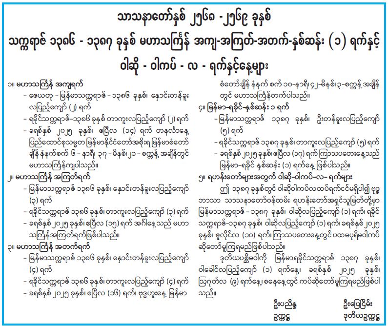သာသနာတော်နှစ် ၂၅၆၈ -၂၅၆၉ ခုနှစ် သက္ကရာဇ် ၁၃၈၆ - ၁၃၈၇ ခုနှစ် မဟာသင်္ကြန် အကျ-အကြတ်-အတက်-နှစ်ဆန်း (၁) ရက်နှင့် ဝါဆို - ဝါကပ် - လ - ရက်နှင့်နေ့များ 03/20/2025