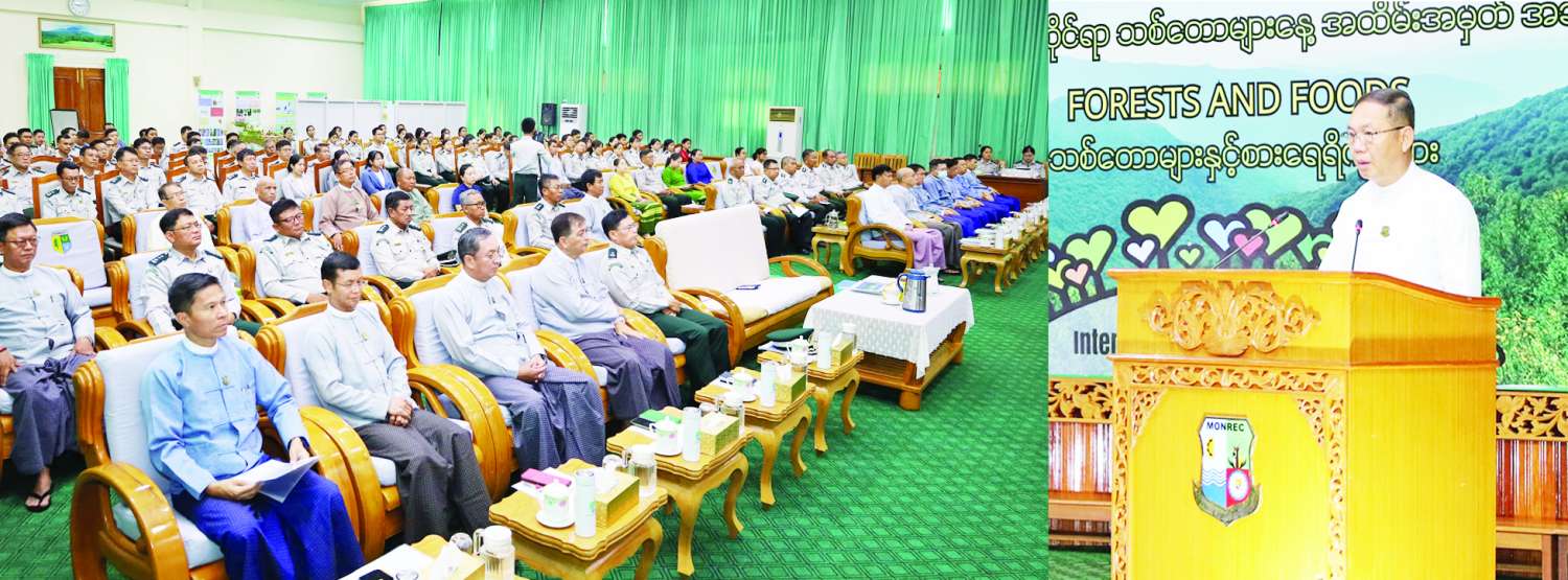 ယနေ့ ကမ္ဘာနှင့်တစ်ဝန်း ရင်ဆိုင်ကြုံတွေ့နေရသည့် ရာသီဥတုပြောင်းလဲမှု၊ ကပ်ရောဂါဖြစ်ပွားမှု၊ ပဋိပက္ခများနှင့် သဘာဝဘေးအန္တရာယ်ကျရောက်မှုများကြောင့် စားရေရိက္ခာထုတ်လုပ်မှုကျဆင်းလာပြီး ကမ္ဘာပေါ်ရှိ လူဦးရေ ၇၃၃ သန်းခန့် ငတ်မွတ်မှုနှင့်ရင်ဆိုင်နေရကာ လူဦးရေ ၈၁၅ သန်းခန့် အာဟာရချို့တဲ့လျက်ရှိကြောင်း ကုလသမဂ္ဂစားရေရိက္ခာနှင့် စိုက်ပျိုးရေးအဖွဲ့ FAO က ထုတ်ပြန်ထားပြီး ကမ္ဘာ့စားရေရိက္ခာဖူလုံစေရေးအတွက် သစ်တောဂေဟစနစ်များ မြှင့်တင်ထိန်းသိမ်းပေးရန် နှိုးဆော်လျက်ရှိကြောင်း၊ စားရေရိက္ခာရရှိမှုနှင့် ထုတ်လုပ်မှုနည်းလမ်းများသည် တည်ငြိမ်သောဂေဟစနစ်နှင့် ကောင်းမွန်မျှတသော ရာသီဥတုရှိမှသာ အောင်မြင်နိုင်မည်ဖြစ်သည့်အတွက် ဂေဟစနစ်အားလုံး၏ ဗဟိုချက်ဖြစ်သော သစ်တောဂေဟစနစ်များကို ကမ္ဘာ့နိုင်ငံများက ပိုမိုအလေးပေးထိန်းသိမ်းဆောင်ရွက်လျက်ရှိကြောင်း၊ နိုင်ငံ၏ သဘာဝပတ်ဝန်းကျင်တိုးတက်ကောင်းမွန်စေပြီး ရာသီဥတုမျှတစေရေးအတွက် သစ်တောစိုက်ခင်းများ တည်ထောင်ခြင်း၊ လမ်းဘေးဝဲယာစိမ်းလန်းစိုပြည်စေရေးအတွက် တစ်အုပ်တစ်မစိုက်ခင်းများ စိုက်ပျိုးခြင်း၊ ထင်းလောင်စာလိုအပ်ချက်ဖြည့်ဆည်းပေးနိုင်ရေးအတွက် ကျေးရွာထင်းစိုက်ခင်းများ တည်ထောင်ခြင်းများကို ဆောင်ရွက်လျက်ရှိသည့်အပြင် အပူပိုင်းဒေသ ၁၃ ခရိုင် စိမ်းလန်းစိုပြည်စေရေးအတွက် တစ်ရွာနှစ်ဧက ဘက်စုံသုံးစိုက်ခင်းများ တည်ထောင်ခြင်းများကို ဆောင်ရွက်လျက်ရှိကြောင်း၊ သစ်ပင်သစ်တောများသည် လူသားများနှင့် ပတ်ဝန်းကျင်အတွက် မရှိမဖြစ်အရေးပါသည့်အတွက် လူတိုင်းက သစ်တောများ၏ အရေးပါမှုနှင့်တန်ဖိုးကို သိရှိနားလည်ပြီး မြန်မာနိုင်ငံရှိ သစ်တောများ ထာဝစဉ်တည်တံ့စေရေး ဝိုင်းဝန်းထိန်းသိမ်းစောင့်ရှောက်သွားရန် တိုက်တွန်းပါကြောင်း ပြောကြားသည်။