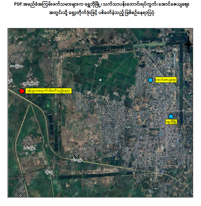 ရွှေဘိုမြို့ရှိ အောင်ဇေယျဈေးအတွင်းသို့ PDF အမည်ခံ အကြမ်းဖက်သမားများက ရှော့တိုက်ဒုံးဖြင့် ပစ်ခတ်၊ ကလေးငယ် ၁ ဦး အပါအဝင် အပြစ်မဲ့ပြည်သူ ၅ ဦး ထိခိုက်ဒဏ်ရာရရှိ