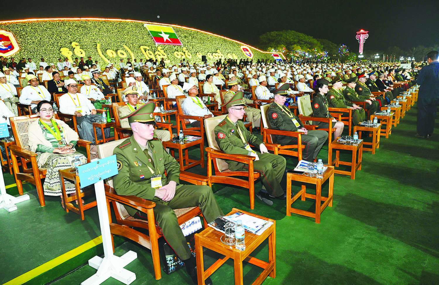 ဆက်လက်၍ နိုင်ငံတော်စီမံအုပ်ချုပ်ရေးကောင်စီဥက္ကဋ္ဌ တပ်မတော်ကာကွယ်ရေးဦးစီးချုပ်၊ စစ်ရေးပြစစ်ကြောင်းကြီးများမှ တပ်မတော်သားများနှင့် မြန်မာနိုင်ငံရဲတပ်ဖွဲ့ဝင်များက နိုင်ငံတော်အလံနှင့် ကျဆုံးလေပြီးသော တပ်မတော်သားများအား အလေးပြုကြပြီး သစ္စာလေးချက်ကို သံပြိုင်ရွတ်ဆိုကြသည်။
