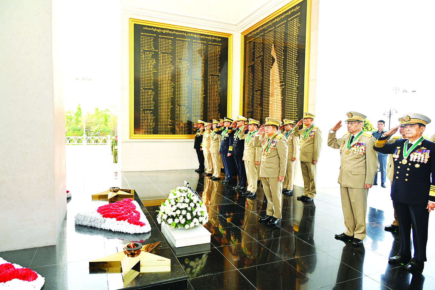 နိုင်ငံတော်စီမံအုပ်ချုပ်ရေးကောင်စီဥက္ကဋ္ဌ တပ်မတော်ကာကွယ်ရေးဦးစီးချုပ် ဗိုလ်ချုပ်မှူးကြီး သတိုးမဟာသရေစည်သူ သတိုးသီရိသုဓမ္မ မင်းအောင်လှိုင်နှင့် တပ်မတော်အရာရှိကြီးများ သူရဲကောင်းဗိမာန်(နေပြည်တော်)၌ ဂုဏ်ပြုပန်းခြင်းချ အလေးပြု
