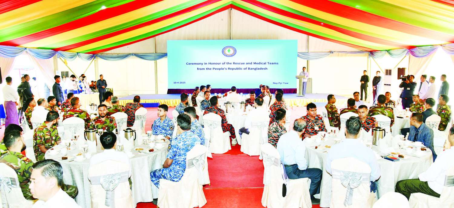 မတ် ၂၈ ရက်တွင် ဖြစ်ပွားခဲ့သည့် ပြင်းထန်ငလျင်နှင့် နောက်ဆက်တွဲငလျင်များကြောင့် ပျက်စီးဆုံးရှုံးမှုများဖြစ်ပေါ်ခဲ့သည့် မြန်မာနိုင်ငံသို့ အရေးပေါ်ကူညီကယ်ဆယ်ရေးလုပ်ငန်းများ လာရောက်လုပ်ဆောင်ခဲ့ပြီး ကယ်ဆယ်ရေးလုပ်ငန်းစဉ်များ ပြီးမြောက်သဖြင့် ဘင်္ဂလားဒေ့ရှ်နိုင်ငံသို့ ပြန်လည်ထွက်ခွာမည့် ဘင်္ဂလားဒေ့ရှ်နိုင်ငံ ရှာဖွေကယ်ဆယ်ရေးနှင့် အရေးပေါ်ကျန်းမာရေးစောင့်ရှောက်မှုအဖွဲ့အား ဂုဏ်ပြုနှုတ်ဆက်ခြင်းအခမ်းအနားကို ယနေ့နံနက်ပိုင်းတွင် နေပြည်တော်ရှိ တပေါင်းကွင်း၌ ကျင်းပပြုလုပ်ရာ အမျိုးသားသဘာဝဘေးအန္တရာယ်ဆိုင်ရာ စီမံခန့်ခွဲမှုကော်မတီဥက္ကဋ္ဌ နိုင်ငံတော်စီမံအုပ်ချုပ်ရေးကောင်စီ ဒုတိယဥက္ကဋ္ဌ ဒုတိယဝန်ကြီးချုပ် ဒုတိယဗိုလ်ချုပ်မှူးကြီး စိုးဝင်း တက်ရောက်၍ ကျေးဇူးတင်ဂုဏ်ပြုအမှာစကားပြောကြားသည်။