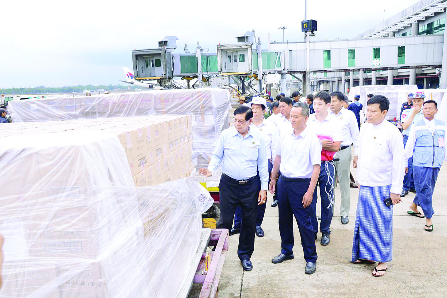အဆိုပါလေယာဉ်ဖြင့် ခြင်ထောင်များ၊ မိုးကာစများနှင့် လူသုံးကုန်၊ စားသောက်ကုန်များ စုစုပေါင်း ၁၄၅၆၂ ထုပ်၊ ၉၀၈၉၃ ကီလိုဂရမ်ပါရှိပြီး ရန်ကုန်အပြည်ပြည်ဆိုင်ရာ လေဆိပ်သို့ရောက်ရှိစဉ် ရန်ကုန် တိုင်းဒေသကြီးဝန်ကြီးချုပ် ဦးစိုးသိန်းနှင့် တိုင်းဒေသကြီးဝန်ကြီးများ၊ နိုင်ငံခြားရေးဝန်ကြီးဌာနနှင့် လူမှုဝန်ထမ်း၊ ကယ်ဆယ်ရေးနှင့် ပြန်လည်နေရာချထားရေးဝန်ကြီးဌာနတို့မှ တာဝန်ရှိသူများ၊ မြန်မာနိုင်ငံဆိုင်ရာ တရုတ်သံရုံးမှ Economic & Commercial Counsellor ဖြစ်သူ Mr.Ou Yang Daobing နှင့် တာဝန်ရှိသူများက ကြိုဆိုလက်ခံခဲ့ကြသည်။