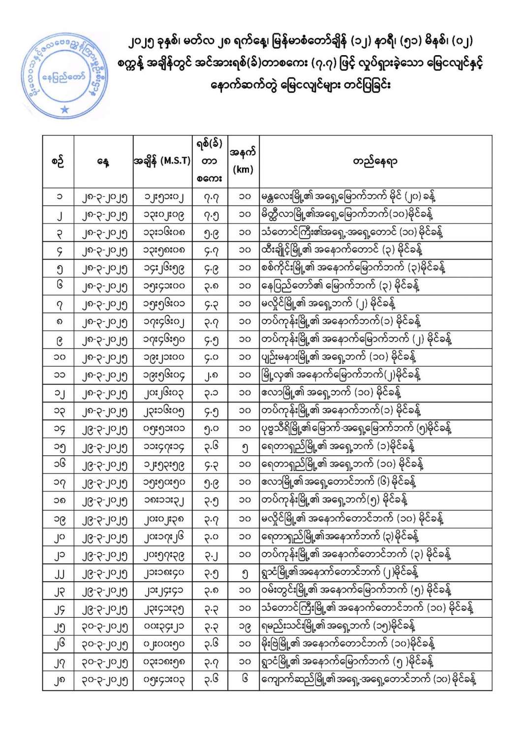 ၂၀၂၅ ခုနှစ်၊ မတ်လ ၂၈ ရက်နေ့၊ မြန်မာစံတော်ချိန်(၁၂)နာရီ၊ (၅၁)မိနစ်၊ (၀၂) စက္ကန့်အချိန်တွင် အင်အားရစ်(ခ်)တာစကေး (၇.၇) ဖြင့် လှုပ်ရှားခဲ့သော မြေငလျင်နှင့် နောက်ဆက်တွဲ မြေငလျင်များ တင်ပြခြင်း