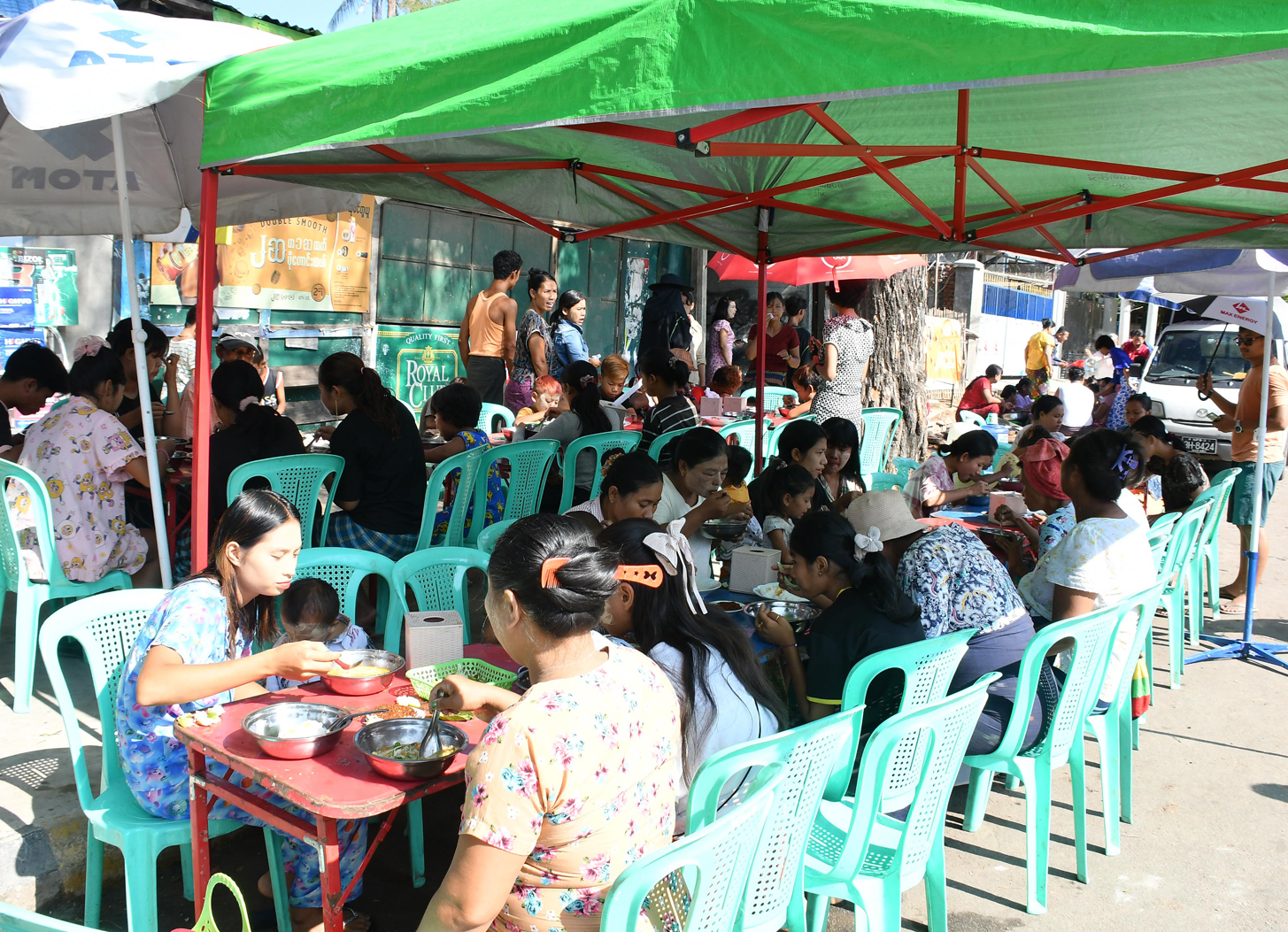 အဆိုပါ အေးသင်္ကြန်မဏ္ဍပ်၌ပင် ကုသိုလ်ကောင်းမှုအလှူအတန်းများအနေဖြင့် သက်ကြီးရွယ်အိုများအား ခေါင်းလျှော်ပေးခြင်း၊ ခြေသည်းလက်သည်း ညှပ်ပေးခြင်းနှင့် နေ့စဉ်နံနက်နှင့်ညနေပိုင်းများတွင် ပါဝင်ဆင်နွှဲကြသည့် ပြည်သူများအား စတုဒိသာကျွေးမွေးလှူဒါန်းခြင်းမြင်ကွင်းက မြန်မာတို့၏ ကုသိုလ်ကောင်းမှု သဒ္ဓါတရားထက်သန်မှုကို ဖော်ကျူးလျက်ရှိသည်။