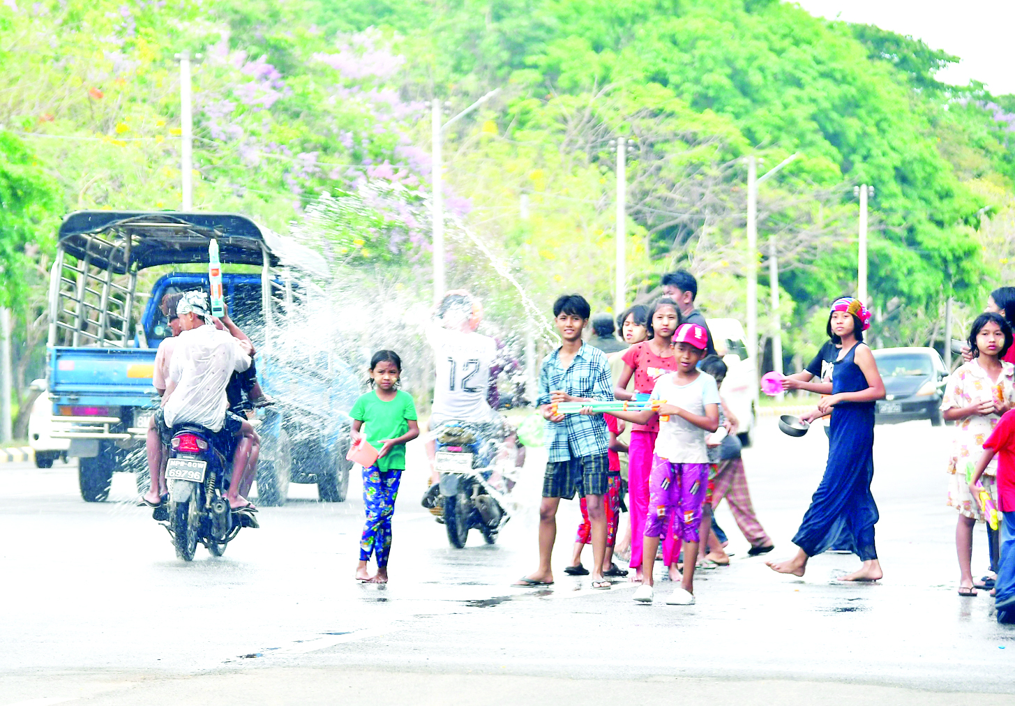 အလားတူ နေပြည်တော်လမ်းလျှောက်သင်္ကြန်သို့ လာရောက်ဆင်နွှဲကြသည့် ပြည်သူများကိုလည်း အေးမြမြနံ့သာရည်ကို ငွေဖလားအတွင်း၌ ထည့်၍ သပြေခက်များဖြင့် ကြိုဆိုပက်ဖျန်းပေးပြီး နှစ်ဟောင်းတွင် ကိန်းအောင်းနေသည့် ဘေးဥပဒ်အန္တရာယ်များ၊ အဆိုးအညံ့များ ပပျောက်ကင်းစင်ကာ သန့်ရှင်းခြင်းသို့ ရောက်ရှိစေရန် အဓိပ္ပာယ်ဖော်ဆောင်သည့်အနေဖြင့် ရေဖလားများဖြင့် ညီရင်းအစ်ကို မောင်ရင်းနှမသဖွယ် ယဉ်ကျေးသိမ်မွေ့စွာ ရေပက်ကစားကြသည်။