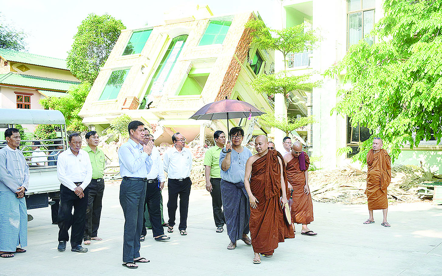 ထိုသို့ လိုက်လံကြည့်ရှုရာတွင် တိုင်းဒေသကြီး ဝန်ကြီးချုပ်နှင့် အဖွဲ့သည် ဓမ္မဓရဝါဆိုကျောင်းတိုက်သို့ သွားရောက်ပြီး ဓမ္မဓရဝါဆိုကျောင်းတိုက်များ၏ အဓိပတိနာယကချုပ် ဆရာတော်ဒေါက်တာအရှင် ကုမာရအားဖူးမြော်၍ ကျောင်းတိုက်ရှိ သာသနိကအဆောက်အအုံများ ထိခိုက်ပြိုကျပျက်စီးခဲ့မှု၊ ဖယ်ရှားရှင်းလင်းခြင်းလုပ်ငန်း၊ ပြန်လည်တည်ဆောက်ရေးလုပ်ငန်းများနှင့် ပတ်သက်၍ ဩဝါဒများခံယူကာ ကျောင်းတိုက်ရှိ ငလျင်ဒဏ်သင့်ခံခဲ့ရသည့် ဆရာတော်၊ သံဃာတော်များအတွက် ဆွမ်းဆန်တော် စသည့်လှူဖွယ်ပစ္စည်းများ ဆက်ကပ်လှူဒါန်းပြီး လိုက်လံကြည့်ရှု၍ လိုအပ်သည်များကို တာဝန်ရှိသူများနှင့် ပေါင်းစပ်ဆောင်ရွက်ပေးသည်။