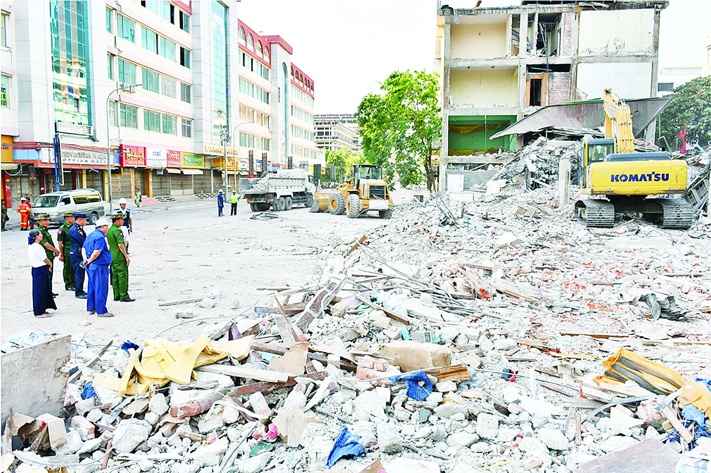 ယင်းနောက် ငလျင်ဒဏ်ကြောင့် ပြိုကျပျက်စီးမှုများဖြစ်ပေါ်ခဲ့သည့် အောင်မြေသာစံမြို့နယ်ရှိ Sky Villa ၊ ချမ်းအေးသာစံမြို့နယ်ရှိ Golden City Hotel ၊ မာကျူရီဟိုတယ်၊ ဘီကျင်ဟိုတယ်၊ တိုင်းသမဝါယမဦးစီးမှူးရုံးနှင့် ချမ်းအေးသာစံမြို့နယ်ရှိ အန္တရာယ်ရှိအဆောက်အဦနေရာများသို့ သွားရောက်၍ အပျက်အစီးများ ရှင်းလင်းဖယ်ရှားနေမှုများအား ကြည့်ရှုပြီး လိုအပ်သည်များကို တာဝန်ရှိသူများနှင့် ပေါင်းစပ်ညှိနှိုင်းဆောင်ရွက်ပေးသည်။