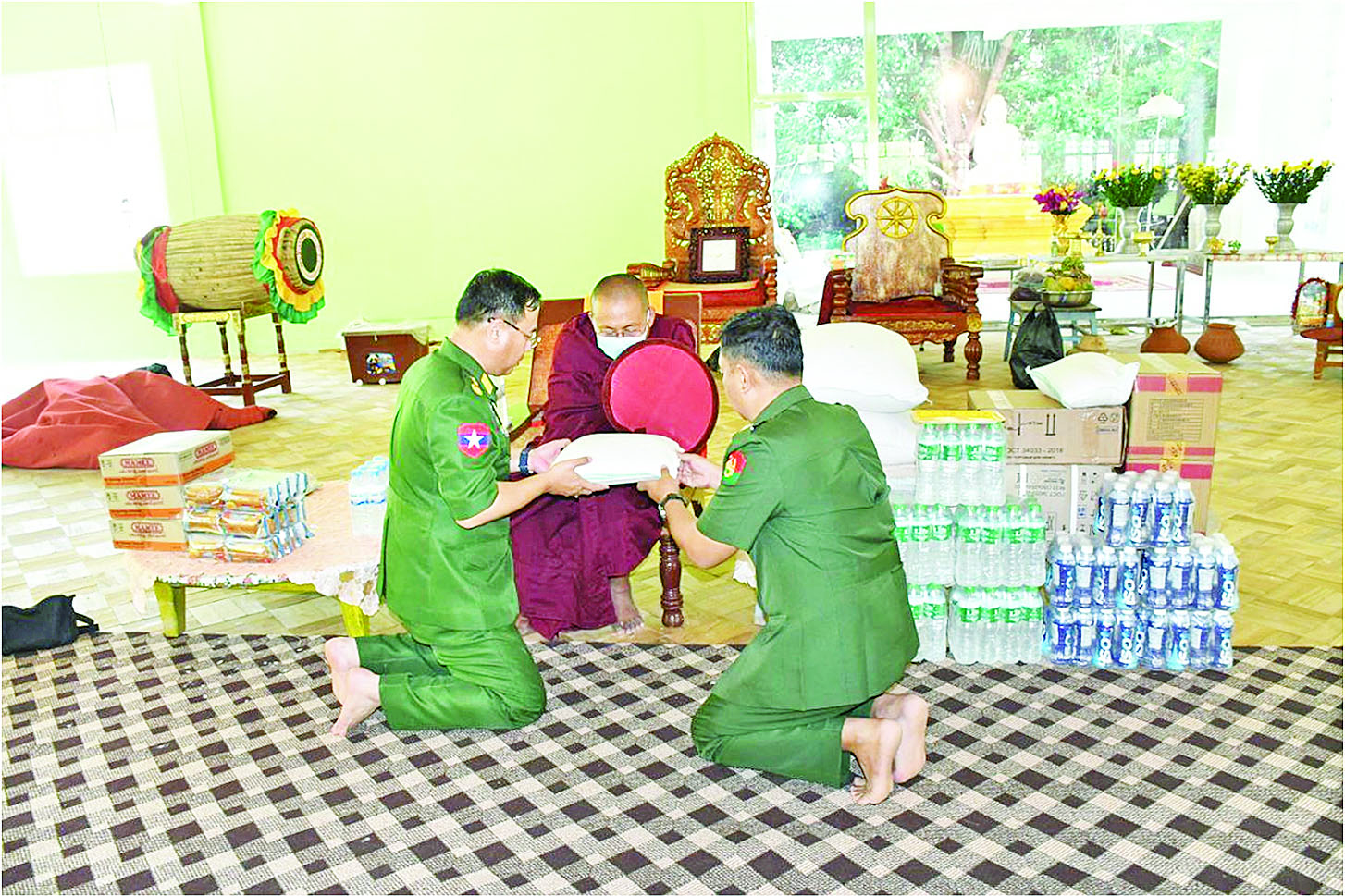 ကာကွယ်ရေးဦးစီးချုပ်ရုံး(ကြည်း)မှ ဒုတိယဗိုလ်ချုပ်ကြီး မျိုးသန့်နိုင်သည် တာဝန်ရှိသူများလိုက်ပါလျက် ကျောက်ဆည်မြို့၊ သင်တောင်းကြီးကျေးရွာရှိ မဟာရွှေသိမ်တော်မြတ်စွာဘုရား၌ ရွှေသင်္ကန်းကပ်လှူခြင်း၊ ကျောက်ဆည်မြို့၊ ကြက်မင်းတွန်ရပ်ကွက်ရှိ ရွှေစေတီဘုန်းတော်ကြီးကျောင်း၌ သန့်ရှင်းရေးပြုလုပ်နေမှုများကိုလည်းကောင်း၊ ယာယီဈေးအဖြစ် ပြောင်းရွှေ့ဖွင့်လှစ်မည့် စည်ပင်သာယာရေးပိုင်နယ်နိမိတ်ဖြစ်သော ဖောင်းရွာရပ်ကွက်၊ ဖောင်းရွာကွင်း၌ မြေနေရာရှင်းလင်းဖော်ထုတ်နေမှုများကို လည်းကောင်း၊ ငလျင်ဒဏ်ကြောင့် ထိခိုက်ခဲ့သည့် မင်းကုန်းမဟာစာသင်တိုက်မှ ကျောင်းဆောင်များအား SOP ဖြင့် စစ်ဆေးခဲ့ပြီး အန္တရာယ်ရှိ (၄)ထပ် ဆောင်အဆောက်အအုံ ဖြိုဖျက်ရှင်းလင်းဆောင်ရွက်ပေးနေမှု အခြေအနေများကိုလည်းကောင်း သွားရောက်ကြည့်ရှုစစ်ဆေးပြီး တာဝန်ရှိသူများ၏ တင်ပြချက်များအပေါ် လိုအပ်သည်များ ညှိနှိုင်းဖြည့်ဆည်းဆောင်ရွက်ပေးသည်။