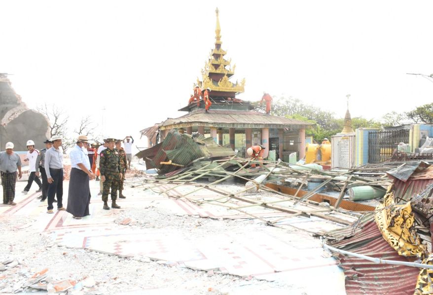 ထို့အတူ ကာကွယ်ရေးဦးစီးချုပ်ရုံး(ကြည်း)မှ ဒုတိယဗိုလ်ချုပ်ကြီး စိုးတင့်နိုင်နှင့် တာဝန်ရှိသူများသည် မန္တလေးမြို့၊ အောင်မြေသာစံမြို့နယ်ရှိ ရတနာဂီရိဂူကြီးတိုက်၊ ချမ်းမြသာစည်မြို့နယ်ရှိ မဟာစန္ဒာမုနိမြတ်စွာဘုရား၊ အမရပူရမြို့နယ်ရှိ လိုရာဆုယူ ဘုရားသုံးဆူ မြတ်စွာဘုရား၊ ပဲ့ပါမင်းကျောင်းတိုက်နေရာများသို့ သွားရောက်၍ ငလျင်ဒဏ်ကြောင့်ပြိုကျပျက်စီးခဲ့သည့် အပျက်အစီးများအား ကူညီကယ်ဆယ်ရေးလုပ်ငန်းများနှင့် အပျက်အစီးများ ဖယ်ရှားရှင်းလင်း ဆောင်ရွက်ပြီးစီးမှုနှင့် ဘုရားစေတီပုထိုးများတွင် ရှေးမူမပျက် ပြန်လည်ပြုပြင်တည်ဆောက်ရေးလုပ်ငန်းများ ဆောင်ရွက်နေမှု အခြေအနေများအားလည်းကောင်း သွားရောက်ကြည့်ရှုအားပေးပြီး၊ ကျောင်းထိုင် ဆရာတော်များအား အလှူငွေနှင့် လှူဖွယ်ဝတ္ထုပစ္စည်းများ ဆက်ကပ်လှူဒါန်းသည်။ ထို့နောက် သန့်ရှင်းရေးဆောင်ရွက်နေသည့်အဖွဲ့များအား စားသောက်ဖွယ်ရာများပေးအပ်ပြီး ပြန်လည်တည်ဆောက်ရေးလုပ်ငန်းများ ဆောင်ရွက်နိုင်ရေးတို့အတွက် တာဝန်ရှိသူများအားမှာကြားကာ လိုအပ်သည်များ ပေါင်းစပ်ညှိနှိုင်း ဆောင်ရွက်ပေးသည်။