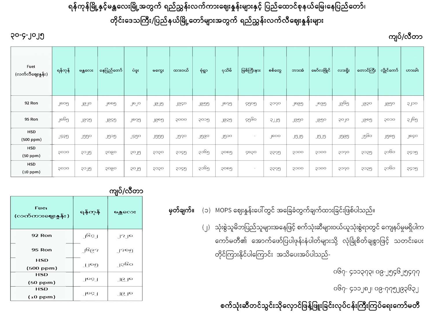 ရန်ကုန်မြို့နှင့် မန္တလေးမြို့အတွက် ရည်ညွှန်းလက်ကားဈေးနှုန်းများနှင့် ပြည်ထောင်စုနယ်မြေ နေပြည်တော်၊ တိုင်းဒေသကြီး/ ပြည်နယ်မြို့တော်များအတွက် ရည်ညွှန်းလက်လီစျေးနှုန်းများ 04/30/2025