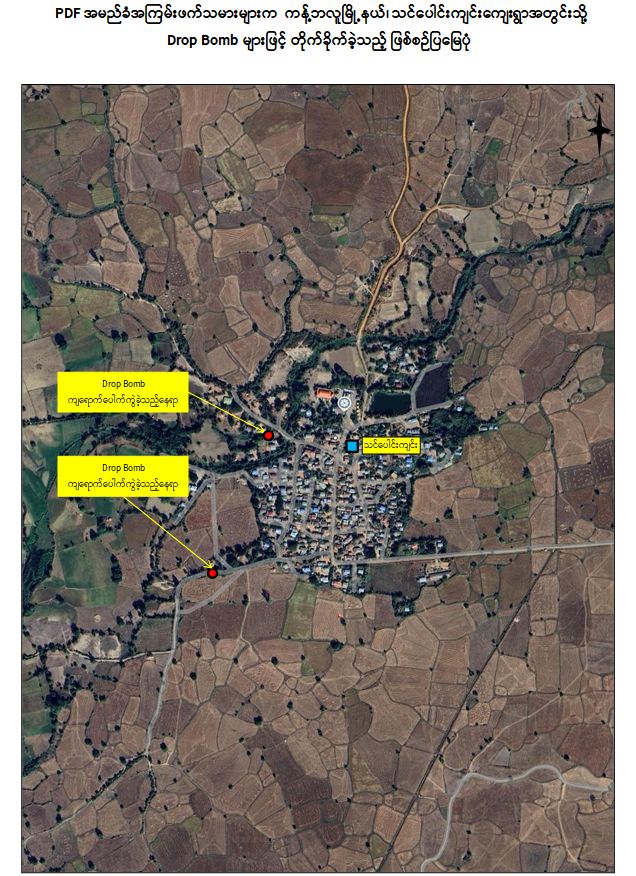 စစ်ကိုင်းတိုင်းဒေသကြီး၊ ကန့်ဘလူမြို့နယ်၊ သင်ပေါင်းကျင်းကျေးရွာကို PDF အမည်ခံအကြမ်းဖက်သမားများက မေ ၆ ရက် နံနက်ပိုင်းတွင် Drop Bomb များဖြင့် ပစ်ချတိုက်ခိုက်ခဲ့သဖြင့် အပြစ်မဲ့ပြည်သူများ သေဆုံး၊ ဒဏ်ရာများ ရရှိခဲ့ကြောင်း သိရှိရသည်။