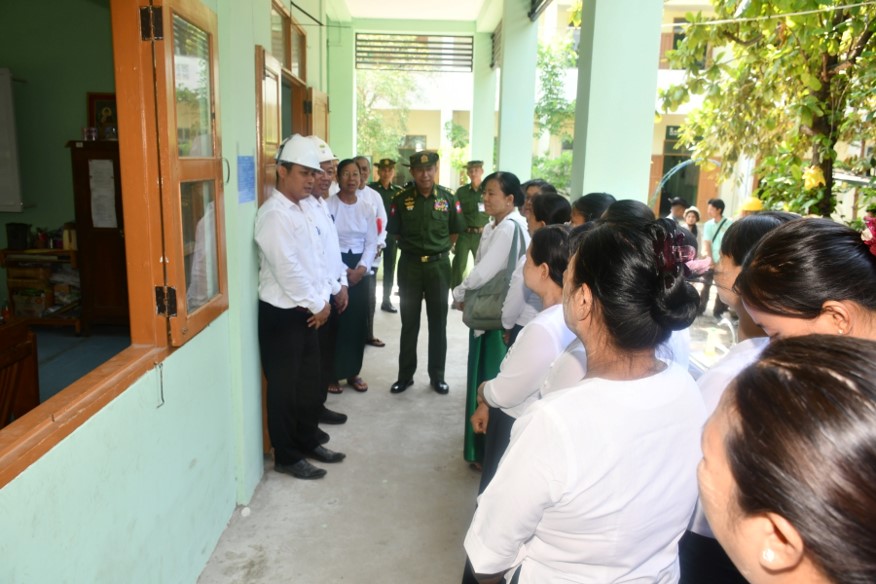 ၎င်းနောက် ၂၆ လမ်းနှင့် ကမ်းနားလမ်းထောင့်ရှိ အမှတ် (၂၁) အခြေခံပညာအထက်တန်းကျောင်းသို့ သွားရောက်၍ ဆရာ/ဆရာမများ၊ ရပ်မိရပ်ဖများ၊ တပ်မတော်သားများစုပေါင်း၍ အပျက်အစီးများ ဖယ်ရှားရှင်းလင်းနေမှုများ၊ ကျောင်းရှိ ထွန်းသစ္စာ (၂) ထပ်ကျောင်းဆောင်၌ Grade-12 Camp (လေ့ကျင့်ရေးစခန်း) ဖွင့်လှစ်ထားရှိသည့် အခြေအနေများ၊ ကျောင်းရှိ ငလျင်ဒဏ်သင့်၍ ထိခိုက်ပျက်စီးခဲ့သော မြစန္ဒာ၊ မြသီတာ၊ မြဧရာ၊ မိဘမေတ္တာ၊ သီရိနှင့် မြရတနာ (၂) ထပ် စာသင်ဆောင်များ၊ ကျောင်းအုပ်ကြီးရုံး၊ ဌေးသန်းမြင့်ခန်းမ၊ သိပ္ပံလက်တွေ့စမ်းသပ်ခန်း၊ ရေသန့်စက်၊ ရေစင်နေရာများအား အသိအမှတ်ပြုလက်မှတ်ရ အင်ဂျင်နီယာ (PE) အဖွဲ့များက (SOP) အတိုင်း စစ်ဆေးနေမှုများနှင့် Level-1 အဆင့် စစ်ဆေးပြီး အဆောက်အအုံများအား ပျက်စီးမှုအဆင့်အတန်းအလိုက် POST EARTHQUAKE ASSESSMENT သတ်မှတ်၍ ခွဲခြားထားသည့် အရောင်များအတိုင်း အဆင့်သတ်မှတ်မှုအခြေအနေများအား လိုက်လံကြည့်ရှုအားပေး၍ တာဝန်ရှိသူများအား ငလျင်ဒဏ်ကြောင့်ပျက်စီးသွားသည့် အဆောက်အအုံများအနက် အသိအမှတ်ပြုလက်မှတ်ရ အင်ဂျင်နီယာ (PE) အဖွဲ့များက (SOP) အတိုင်းစစ်ဆေးပြီး အဆင့်သတ်မှတ်ပြီးစီးသည့် အဆောက်အအုံများအား ဦးစားပေးအဆင့်အလိုက် ဖယ်ရှားရှင်းလင်းရေး၊ ပြန်လည်ပြုပြင်တည်ဆောက်ရေး လုပ်ငန်းများ အမြန်ဆုံးဆောင်ရွက်နိုင်ရေးနှင့် အသုံးပြု၍ရသည့် ပရိဘောဂပစ္စည်းများအား စနစ်တကျပြန်လည်ပြုပြင်ထိန်းသိမ်းသွားရန်မှာကြားပြီး လိုအပ်သည်များ ပေါင်းစပ်ညှိနှိုင်းဆောင်ရွက်ပေးသည်။