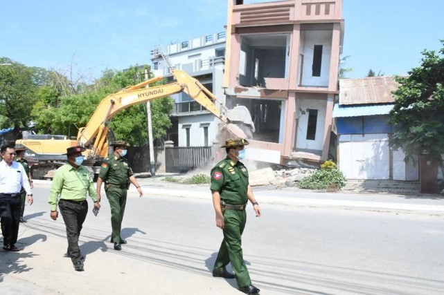 အလားတူ ကာကွယ်ရေးဦးစီးချုပ်ရုံး (ကြည်း) မှ ဒုတိယဗိုလ်ချုပ်ကြီး မျိုးသန့်နိုင်နှင့် တာဝန်ရှိသူများသည် ကျောက်ဆည်မြို့၊ အေးမြကြည်လင်ရပ်ကွက်နှင့် တံစိုး-မင်းစုသွားကားလမ်းမပေါ်တို့ရှိ နေထိုင်ရန်မသင့်သော အန္တရာယ်ရှိအဆောက်အအုံများအား ယန္တရားများဖြင့် ရှင်းလင်းဆောင်ရွက်နေမှုအား သွားရောက်ကြည့်ရှုစစ်ဆေးပြီး အဆောက်အအုံများ ရှင်းလင်းဆောင်ရွက်ရာတွင် ပတ်ဝန်းကျင်ရှိ အဆောက်အအုံများ ထိခိုက်မှုမရှိစေဘဲ ရှင်းလင်းဆောင်ရွက်နိုင်ရေး၊ လျှပ်စစ်မီးကြိုးများအား စနစ်တကျ ကြိုတင်ရှင်းလင်းဆောင်ရွက်နိုင်ရေး၊ လုပ်ငန်းခွင်အန္တရာယ်ထိခိုက်မှုမရှိစေရန်နှင့် အပျက်အစီးများကြောင့် ယာဉ်ကြောပိတ်ဆို့မှုများမဖြစ်ပေါ်စေရန် အမြန်ရှင်းလင်းဆောင်ရွက်နိုင်ရေးမှာကြားပြီး တာဝန်ရှိသူများမှ တင်ပြချက်များအပေါ် လိုအပ်သည်များ ပေါင်းစပ်ညှိနှိုင်းဆောင်ရွက်ပေးသည်။ ကျောက်ဆည်ခရိုင်အတွင်း ငလျင်ဒဏ်သင့်အဆောက်အအုံများအား SOP စနစ်ဖြင့် ဘုတ်အဖွဲ့များ ဖွဲ့စည်းစစ်ဆေးခဲ့ရာ ယနေ့အထိအဆောက်အဦ (၆၄၅၁) လုံးအား စစ်ဆေးခြင်းဆောင်ရွက်ခဲ့ပြီး ပြန်လည်ပြုပြင်နေထိုင်နိုင်မည့် အဆောက်အအုံ (၆၁၄၆) လုံး၊ ဦးစားပေးဖြိုဖျက်ရှင်းလင်းရမည့် အန္တရာယ်ရှိ အဆောက်အအုံ (၃၀၅) လုံးမှ အဆောက်အအုံ (၂၇၇) လုံးအား ရှင်းလင်းဆောင်ရွက်နိုင်ခဲ့ပြီး ဆောင်ရွက်ရန်ကျန် အဆောက်အအုံ (၂၈) လုံး ဖြစ်သည်။