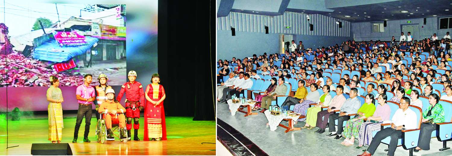 ငလျင်ဘေးဒဏ်သင့်ဒေသများ ပြန်လည်ထူထောင်ရေး ရုပ်ရှင်၊ သဘင်၊ ဂီတရန်ပုံငွေပဒေသာ ကပွဲဖျော်ဖြေမှုကို ယနေ့ညပိုင်းတွင် ရန်ကုန်မြို့ ဒဂုံမြို့နယ် မြို့မကျောင်းလမ်းရှိ အမျိုးသားဇာတ်ရုံတွင်ကျင်းပရာ ပြန်ကြားရေးဝန်ကြီးဌာန ပြည်ထောင်စုဝန်ကြီး ဦးမောင်မောင်အုန်း၊ ရန်ကုန်တိုင်းဒေသကြီးဝန်ကြီးချုပ် ဦးစိုးသိန်းနှင့် တိုင်းဒေသကြီးဝန်ကြီးများ၊ ဖိတ်ကြားထားသော ဧည့်သည်တော်များ၊ ပြည်သူများ ကြည့်ရှုအားပေးကြသည်။