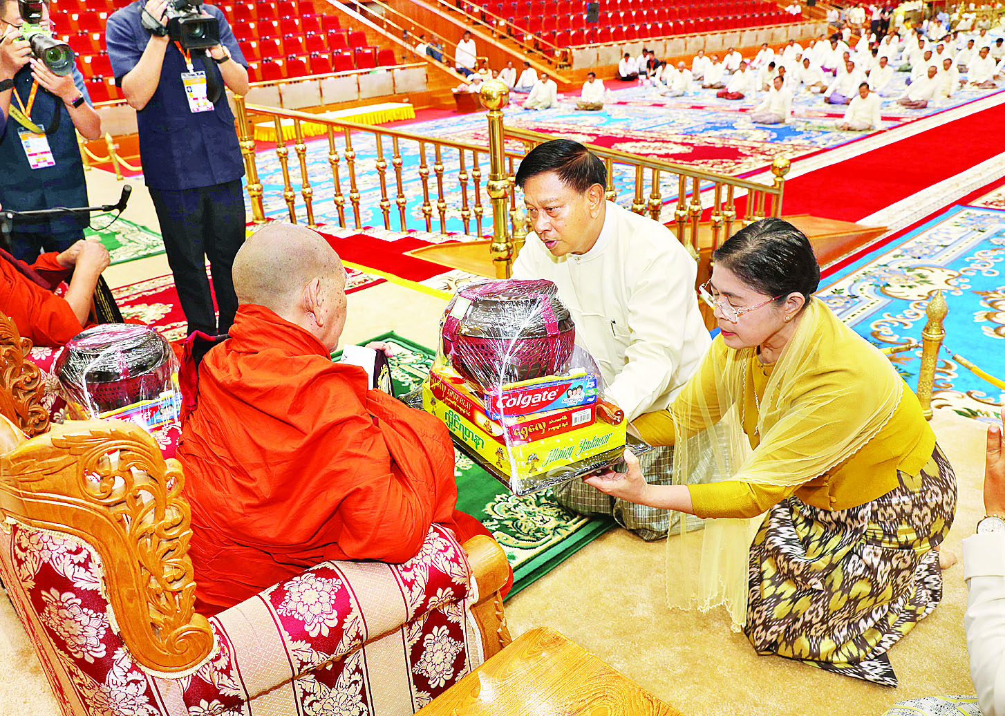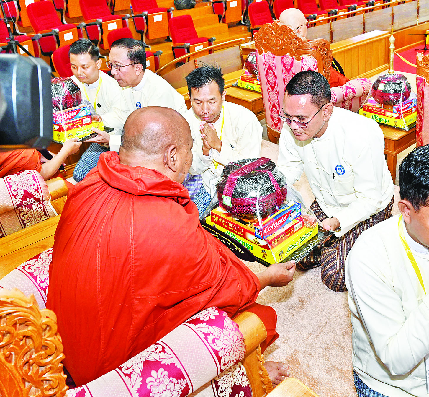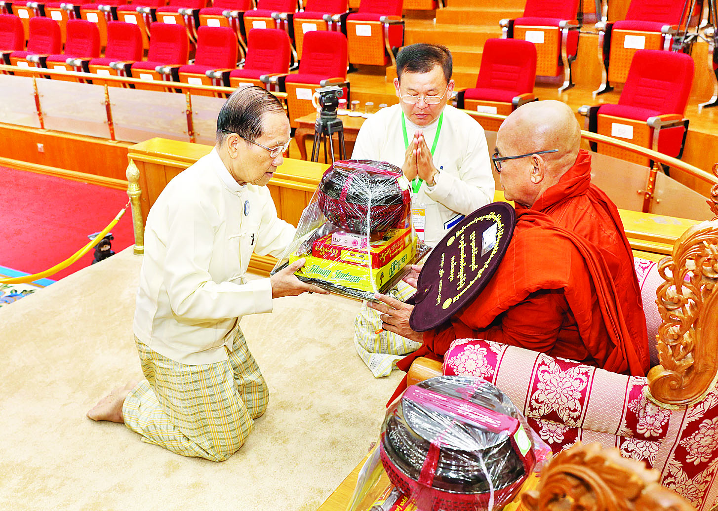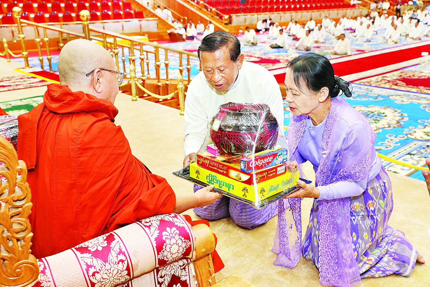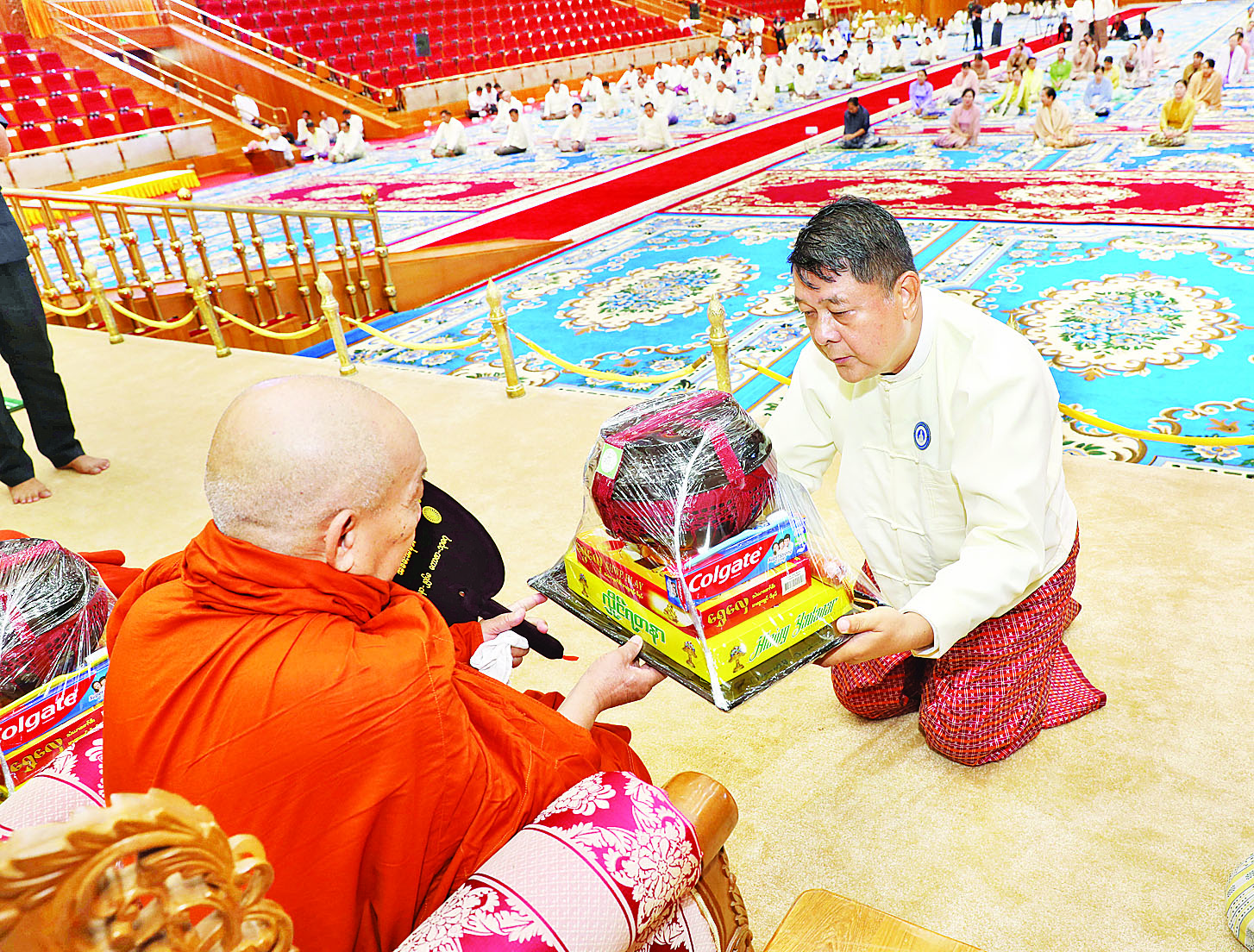 ယင်းနောက် နိုင်ငံတော်စီမံအုပ်ချုပ်ရေးကောင်စီ ဒုတိယဥက္ကဋ္ဌ ဒုတိယဝန်ကြီးချုပ်နှင့်ဇနီးတို့က နိုင်ငံတော်သံဃမဟာ နာယကအဖွဲ့ဥက္ကဋ္ဌ သန်လျင်မင်းကျောင်း ဆရာတော်ကြီး အားလည်းကောင်း၊ကောင်စီ အတွင်းရေးမှူးနှင့်ဇနီးတို့က နိုင်ငံတော် သံဃမဟာနာယကအဖွဲ့ အကျိုးတော်ဆောင်၊ မန္တလေးမြို့မစိုးရိမ်တိုက်သစ် မဟာနာယက ဆရာတော်ကြီးအားလည်းကောင်း၊ ကောင်စီအဖွဲ့ဝင်များနှင့် ဇနီးများ၊ အခမ်းအနားသို့ တက်ရောက်လာသည့် အကြီးအကဲများနှင့် ဇနီးများက ဆရာတော်ကြီးများအားလည်းကောင်း လှူဖွယ်ဝတ္ထုပစ္စည်းများကို ဆက်ကပ်လှူဒါန်းကြသည်။