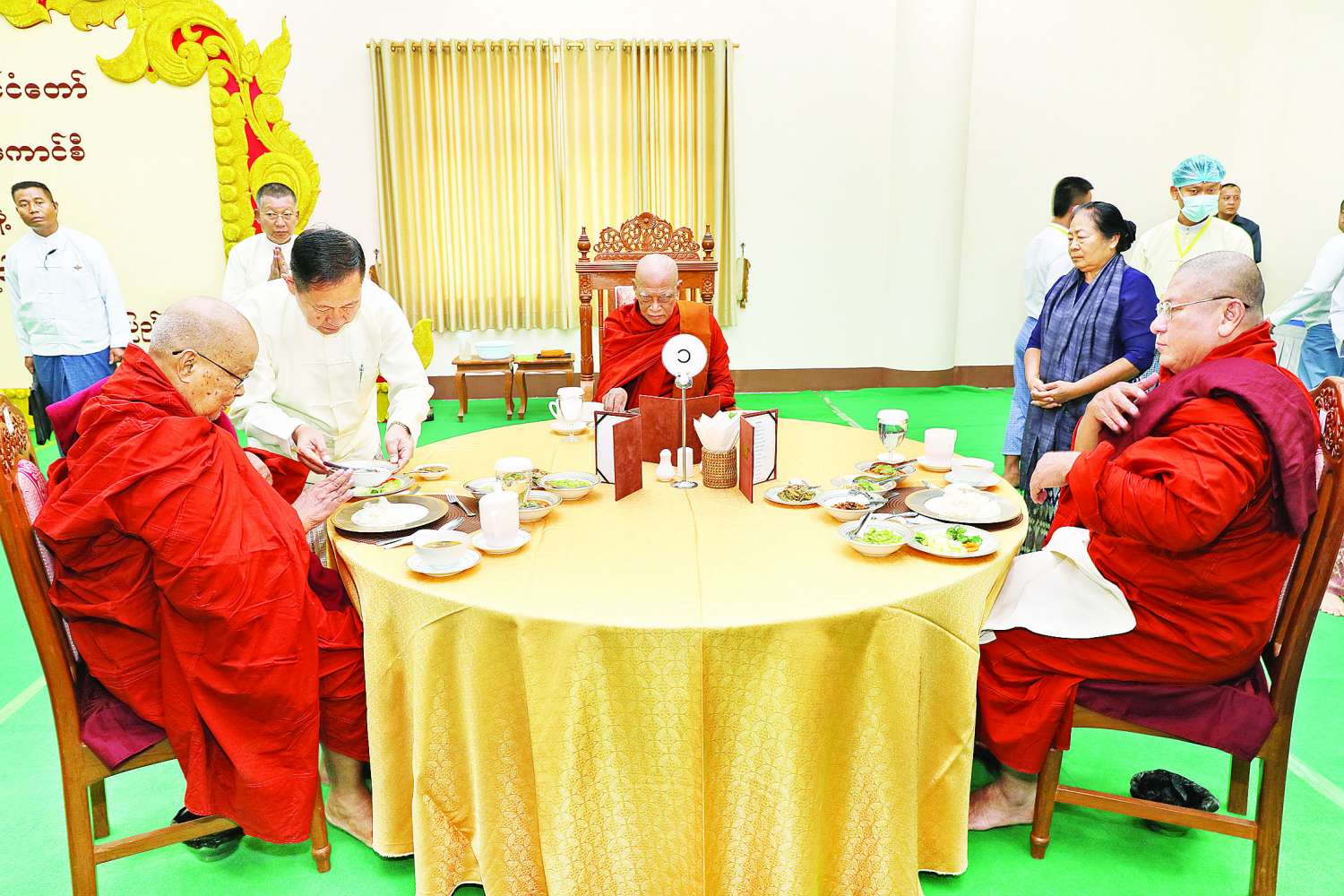 အခမ်းအနားသို့ အထူးပင့်ဖိတ်ထားသည့် နိုင်ငံတော် သံဃမဟာနာယကအဖွဲ့ဥက္ကဋ္ဌ ရန်ကုန်တိုင်းဒေသကြီး သန်လျင်မြို့မင်းကျောင်းပထမပြန် စာသင်တိုက်ပဓာနနာယက၊ အဂ္ဂမဟာပဏ္ဍိတ အဂ္ဂမဟာသဒ္ဓမ္မဇောတိကဓဇ ဒေါက်တာဘဒ္ဒန္တစန္ဒိမာဘိဝံသနှင့် နိုင်ငံတော်သံဃမဟာနာယကအဖွဲ့ အကျိုးတော်ဆောင်၊ မန္တလေးတိုင်းဒေသကြီးမဟာ အောင်မြေမြို့နယ် မစိုးရိမ်တိုက်သစ် မဟာနာယက ဓမ္မသမိဒ္ဓိ ကျောင်းဆရာတော် အဂ္ဂမဟာပဏ္ဍိတ အဂ္ဂမဟာ သဒ္ဓမ္မဇောတိကဓဇ မဟာဓမ္မ ကထိကဗဟုဇနဟိတဓရ ဘဒ္ဒန္တဝါသေဋ္ဌာဘိဝံသတို့ အမှူးပြုသည့် ဆရာတော်ကြီးများ ကြွရောက်ချီးမြှင့်တော်မူကြပြီး နိုင်ငံတော် စီမံအုပ်ချုပ်ရေးကောင်စီ ဒုတိယဥက္ကဋ္ဌ ဒုတိယဝန်ကြီးချုပ်နှင့် ဇနီးတို့နှင့်အတူ ကောင်စီအတွင်းရေးမှူးနှင့် ဇနီး၊ ကောင်စီဝင်များနှင့် ဇနီးများ၊ ပြည်ထောင်စုအဆင့်ပုဂ္ဂိုလ်များ၊ ပြည်ထောင်စုဝန်ကြီးများနှင့် ဇနီးများ၊ နေပြည်တော်ကောင်စီဥက္ကဋ္ဌ၊ ကာကွယ်ရေးဦးစီးချုပ်ရုံးမှ အဆင့်မြင့်တပ်မတော် အရာရှိကြီးများနှင့်ဇနီးများ၊ နေပြည်တော် တိုင်းစစ်ဌာနချုပ်တိုင်းမှူးနှင့် တာဝန်ရှိသူများ တက်ရောက်ကြည်ညိုကြသည်။