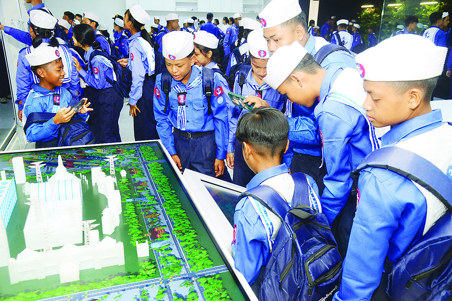 ထို့နောက် လေ့လာရေးခရီး လာရောက်ကြသော ရေကြောင်းလူငယ်သင်တန်းသား သင်တန်းသူများအား ပြခန်း ခန်းမဆောင်၌ ပြသထားသော နျူကလီးယားနည်းပညာအသုံးပြု၍ ရောဂါရှာဖွေမှု (တိုမိုဂရမ်) နမူနာပုံစံ၊ အသေးစားလျှပ်စစ်ဓာတ်အားထုတ် ဓာတ်ပေါင်းဖိုအမျိုးအစားတစ်ခုဖြစ်သော RITM-200 ၏ အတွင်းပိုင်းပါဝင်ပစ္စည်းများနှင့် အလုပ်လုပ်ပုံပြနမူနာပုံစံ၊ ခန္ဓာကိုယ်၏ ဓာတ်ရောင်ခြည်ပမာဏကိုတိုင်းတာပြီး သဘာဝပတ်ဝန်းကျင်ရှိ အရာဝတ္ထုပစ္စည်းများတွင် ပါရှိသော ဓာတ်ရောင်ခြည်ပမာဏနှင့် နှိုင်းယှဉ်ဖော်ပြပေးသည့် Radiometer စက်၊ နျူကလီးယားနည်းပညာဆိုင်ရာ အခြေခံအကြောင်းအရာများကို မေးခွန်းများမေး၍ ဖြေကြားနိုင်သည့် ပဟေဠိဂိမ်းစနစ်၊ သဲ၊ ကျောက်၊ ဘိလပ်မြေစသည့် သဘာဝပတ်ဝန်းကျင်ရှိ အရာဝတ္ထုများတွင် ထွက်ရှိလျက်ရှိသော ရေဒီယိုသတ္တိကြွမှုကို တိုင်းတာဖော်ပြပေးသည့်စက်၊ နျူကလီးယား ဓာတ်ပေါင်းဖိုတစ်ခု၏ အတွင်းပိုင်းပါဝင်ပစ္စည်းများနှင့် အဆင့်ဆင့်တည်ဆောက်ပုံကို 3D Virtual နည်းပညာဖြင့် ပုံဖော်ပြသထားသည့် ပုံစံငယ်နှင့်လေအားအသုံးပြု၍ လျှပ်စစ်ဓာတ်အားထုတ်လုပ်သည့် Wind Turbine နမူနာပုံစံငယ်တို့ကို အသေးစိတ်ရှင်းလင်းပြောကြားသည်။