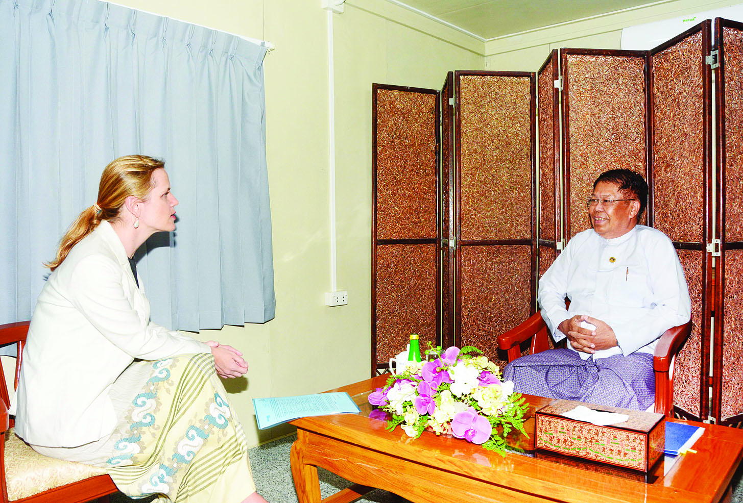 ဒုတိယဝန်ကြီးချုပ်နှင့် နိုင်ငံခြားရေးဝန်ကြီးဌာန ပြည်ထောင်စုဝန်ကြီး ဦးသန်းဆွေသည် ကုလသမဂ္ဂစီမံကိန်းဝန်ဆောင်မှုရုံး (UNOPS) ၏ မြန်မာနိုင်ငံဆိုင်ရာ ညွှန်ကြားရေးမှူးနှင့် ကိုယ်စားလှယ် Ms. Sara Austin Netzer အား ယနေ့မွန်းလွဲ ၁ နာရီတွင် နိုင်ငံခြားရေးဝန်ကြီးဌာန၌ လက်ခံတွေ့ဆုံသည်။