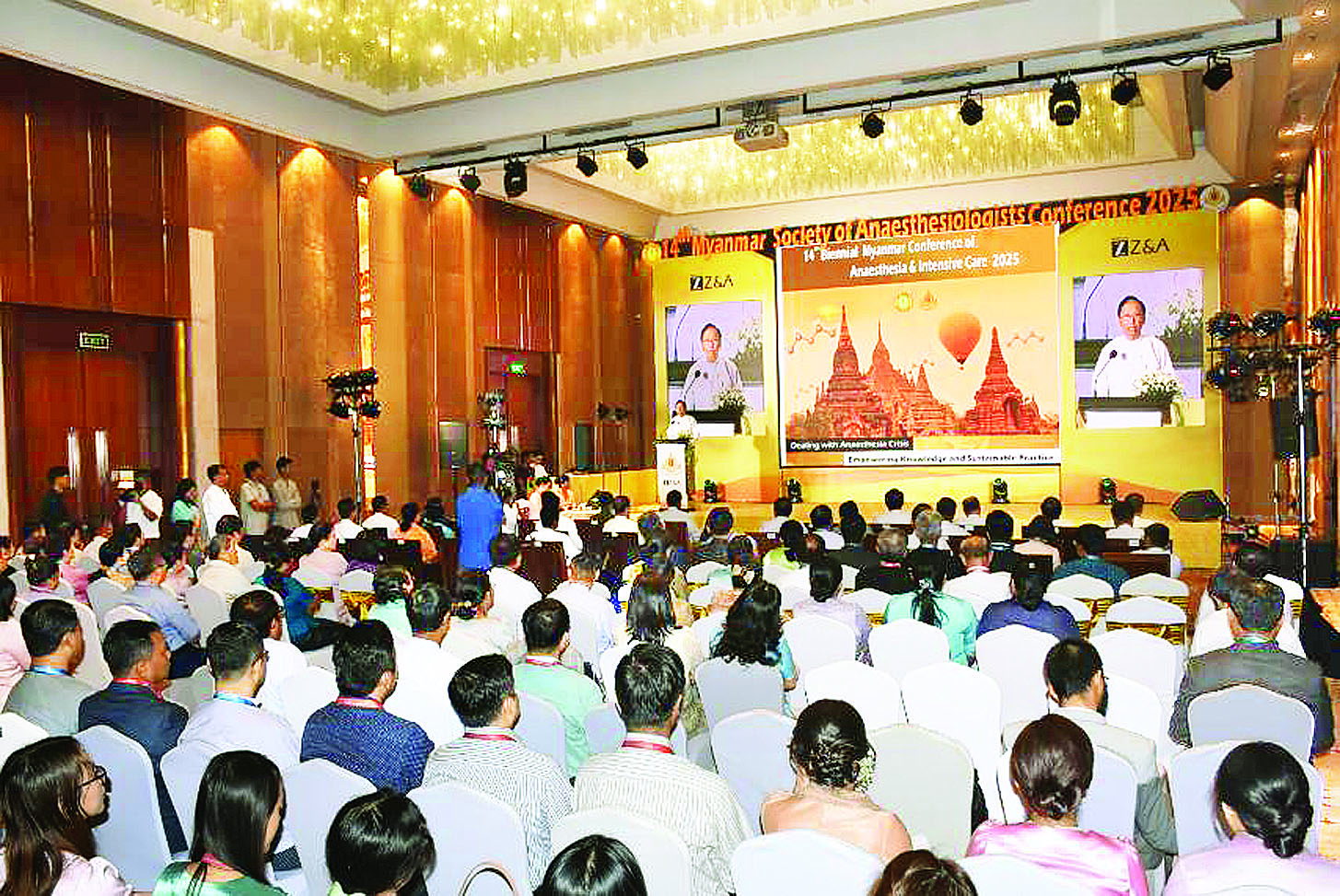 ဦးစွာ ပြည်ထောင်စုဝန်ကြီးက မြန်မာနိုင်ငံမေ့ဆေးညီလာခံကို နှစ်နှစ်လျှင် တစ်ကြိမ်ပုံမှန်ကျင်းပလာခဲ့ရာ ယခုကျင်းပပြုလုပ်သည့် ညီလာခံမှာ (၁၄) ကြိမ်မြောက်ဖြစ်ပါကြောင်း၊ မေ့ဆေးအထူးကုဆရာဝန်များအနေဖြင့် အထူးကြပ်မတ်ကုသမှုများကိုပါ ပူးတွဲဆောင်ရွက်ပေးနေကြပြီး ရှောင်တခင်ဖြစ်ပေါ်တတ်သော အရေးပေါ်ကျန်းမာရေးအခြေအနေများအတွက် မကြာခဏတွေ့ကြုံရလေ့ရှိရာ မှန်ကန်စွာနှင့် မြန်ဆန်စွာဖြေရှင်းဆောင်ရွက်နိုင်မှသာ အန္တရာယ်ကင်း၍ စိတ်ချရသော ကုသမှုများ ဆောင်ရွက်နိုင်မည်ဖြစ်သဖြင့် ယခုညီလာခံ၏ ခေါင်းစီးအနေဖြင့် “Dealing with Anaesthesia Crisis : Empowering Knowledge and Sustainable Practice” အဖြစ် သတ်မှတ်ဆောင်ရွက်ခြင်းဖြစ်ပါကြောင်း။