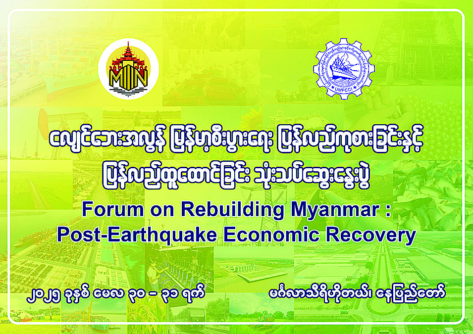 ပြန်ကြားရေးဝန်ကြီးဌာနနှင့် စီးပွားရေးနှင့်ကူးသန်းရောင်းဝယ်ရေးဝန်ကြီးဌာနတို့ ကြီးမှူး၍ မြန်မာ့ပုံရိပ် ဖော်ညွှန်းရေးအဖွဲ့ (Myanmar Narrative Think Tank) က စီစဉ်ကျင်းပသော “ငလျင်ဘေးအလွန် မြန်မာ့စီးပွားရေး ပြန်လည်ကုစားခြင်းနှင့် ပြန်လည်ထူထောင်ခြင်း” (Forum on Rebuilding Myanmar: Post-Earthquake Economic Recovery) သုံးသပ်ဆွေးနွေးပွဲကို မေ ၃၀ ရက်နှင့် ၃၁ ရက်တို့တွင် နေပြည်တော်ရှိ မင်္ဂလာသီရိဟိုတယ်၌ ကျင်းပမည်ဖြစ်သည်။