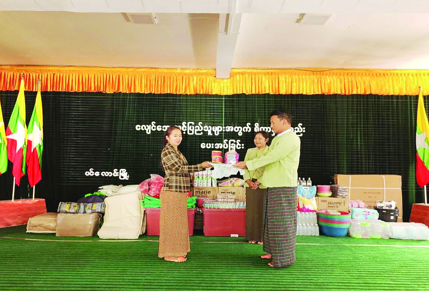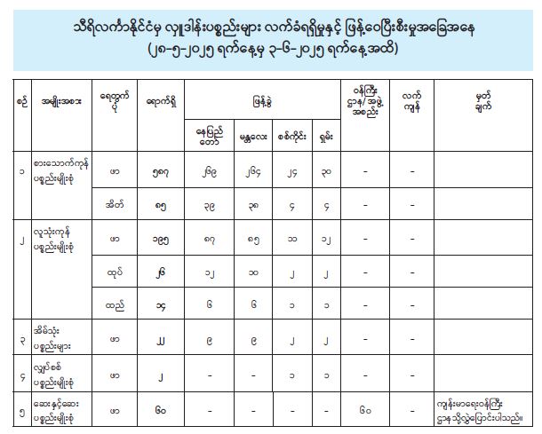 ယခုအခါ မေလ ၂၈ ရက်နေ့မှ ဇွန်လ ၃ ရက်နေ့အထိ ရက်သတ္တပတ် ၁ ပတ်အတွင်း သီရိလင်္ကာ နိုင်ငံမှထပ်မံပေးပို့လှူဒါန်းလာ သောစားသောက်ကုန်၊ လူသုံးကုန်၊ အိမ်သုံးပစ္စည်း၊ လျှပ်စစ်ပစ္စည်း၊ ဆေးနှင့်ဆေးပစ္စည်းများအနက် ဆေးနှင့်ဆေးပစ္စည်းများကို ကျန်းမာရေးစောင့်ရှောက်မှု လုပ်ငန်းကော်မတီ (ကျန်းမာရေးဝန်ကြီးဌာန) သို့လည်းကောင်း၊ စားသောက်ကုန်၊ လူသုံးကုန်၊ အိမ်သုံးပစ္စည်း၊ လျှပ်စစ်ပစ္စည်းများကို ဘေးသင့်လူဦးရေအချိုး အစားအပေါ်မူတည်၍ နေပြည်တော်၊ စစ်ကိုင်းတိုင်းဒေသကြီး၊ မန္တလေးတိုင်းဒေသကြီးနှင့် ရှမ်းပြည်နယ်တို့သို့ဖြန့်ခွဲပေးပို့ပြီး ဖြစ်ပါသည်။