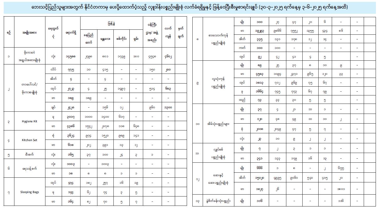 နိုင်ငံတကာအလှူရှင်များက ၂၈-၅-၂၀၂၅ ရက်နေ့မှ ၃-၆-၂၀၂၅ ရက်နေ့အထိရက်သတ္တပတ် ၁ ပတ်အတွင်း ပေးပို့လှူဒါန်းသည့် ပစ္စည်းများအား ဘေးသင့်ပြည်သူ များအတွက် ဖြန့်ခွဲပေးပို့နိုင်ရေး ဆောင်ရွက်ထားမှုကို ပူးတွဲပါဇယားများဖြင့် ဖော်ပြအပ်ပါသည်။ ထပ်မံလှူဒါန်းလာသည့် ပစ္စည်းများရောက်ရှိမှုနှင့် ငလျင်ဘေးသင့်ပြည်သူများထံ အမြန်ဆုံးရောက်ရှိဖြန့်ခွဲမှုတို့ကို ၁ ပတ်လျှင် ၁ ကြိမ် ဆက်လက်သတင်းထုတ်ပြန်သွားမည်ဖြစ်ကြောင်း သတင်းထုတ်ပြန်အပ်ပါသည်။
