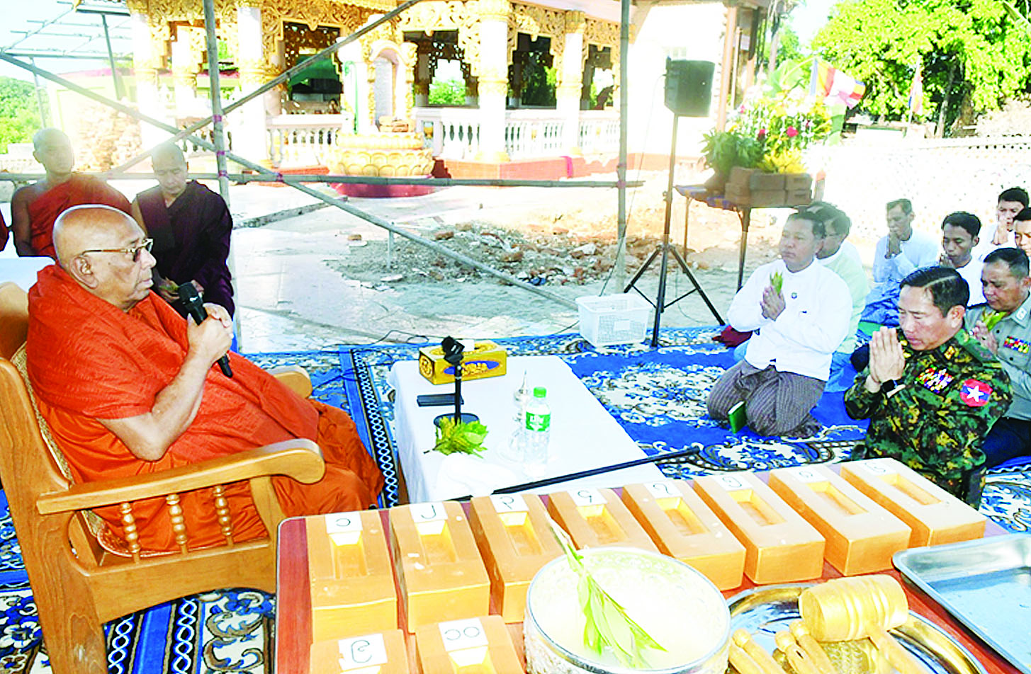 ၎င်းနောက် အုတ်မြစ်ချခြင်းမင်္ဂလာအခမ်းအနားကို သံဃာတော်များ၊ ဒုတိယဗိုလ်ချုပ်ကြီးသက်ပုံနှင့် တာဝန်ရှိသူများက ဆက်လက်ဆောင်ရွက်ကြပြီး အမွှေးနံသာရေများ ပက်ဖျန်း၍ ရွှေမိုးငွေမိုးများ ရွာသွန်းဖြိုးကာ အခမ်းအနားကို ရုတ်သိမ်းခဲ့ကြောင်း သတင်းရရှိသည်။