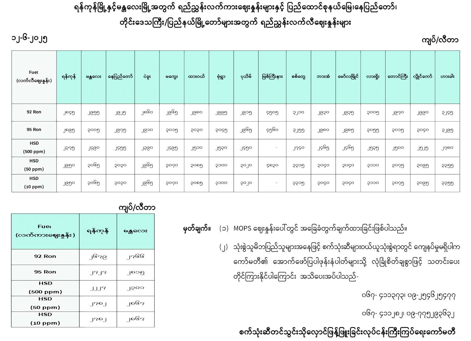 ရန်ကုန်မြို့နှင့် မန္တလေးမြို့အတွက် ရည်ညွှန်းလက်ကားဈေးနှုန်းများနှင့် ပြည်ထောင်စုနယ်မြေ နေပြည်တော်၊ တိုင်းဒေသကြီး/ပြည်နယ် မြို့တော်များအတွက် ရည်ညွှန်းလက်လီဈေးနှုန်းများ 06/12/2025