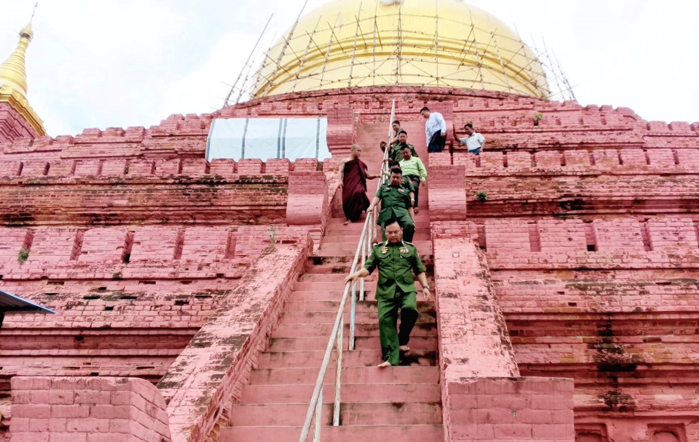 ထို့အတူ ကာကွယ်ရေးဦးစီးချုပ်ရုံး(ကြည်း)မှ ဒုတိယဗိုလ်ချုပ်ကြီး စိုးတင့်နိုင်နှင့် တာဝန်ရှိသူများသည် မန္တလေးမြို့၊ အမရပူရမြို့နယ်၊ တောင်သမန်ကျေးရွာရှိ မဟာသကျရံသီ ကျောက်တော်ကြီး မြတ်စွာဘုရားများသို့ သွားရောက်၍ ငလျင်ဒဏ်ကြောင့် ပြိုကျပျက်စီးခဲ့သော စိန်ဖူးတော်များနှင့် ဋ္ဌာပနာပစ္စည်းများအား သိမ်းဆည်းထားရှိမှု အခြေအနေများအား ကြည့်ရှုစစ်ဆေး၍ အပျက်အစီးများ စတင်ရှင်းလင်းဆောင်ရွက်နေမှု အခြေအနေများအားလည်းကောင်း၊ ဘုရားပရိဝုဏ်အတွင်း ပြန်လည်ပြုပြင်တည်ဆောက်ရေးလုပ်ငန်းများဆောင်ရွက်နေမှု အခြေအနေများအားလည်းကောင်း၊ မှန်တန်းရပ်ရှိ မဏိဇောတဓမ္မရိပ်သာကျောင်းတိုက်သို့ ရောက်ရှိပြီး ငလျင်ဒဏ်ကြောင့် ထိခိုက်ပျက်စီးခဲ့သော သာသနိကအဆောက်အအုံအပျက်အစီးများအား စက်ယန္တရားများအသုံးပြု၍ အင်တိုက်အားတိုက် ဖယ်ရှားရှင်းလင်းနေမှုအခြေအနေများအား ကြည့်ရှုစစ်ဆေးပြီး ကျောင်းထိုင်ဆရာတော်ကြီးအား သွားရောက်ဖူးမြော်ကြည်ညို၍ တာဝန်ရှိသူများ၏ တင်ပြချက်များအပေါ် လိုအပ်သည်များ ပေါင်းစပ်ညှိနှိုင်းဆောင်ရွက်ပေးသည်။