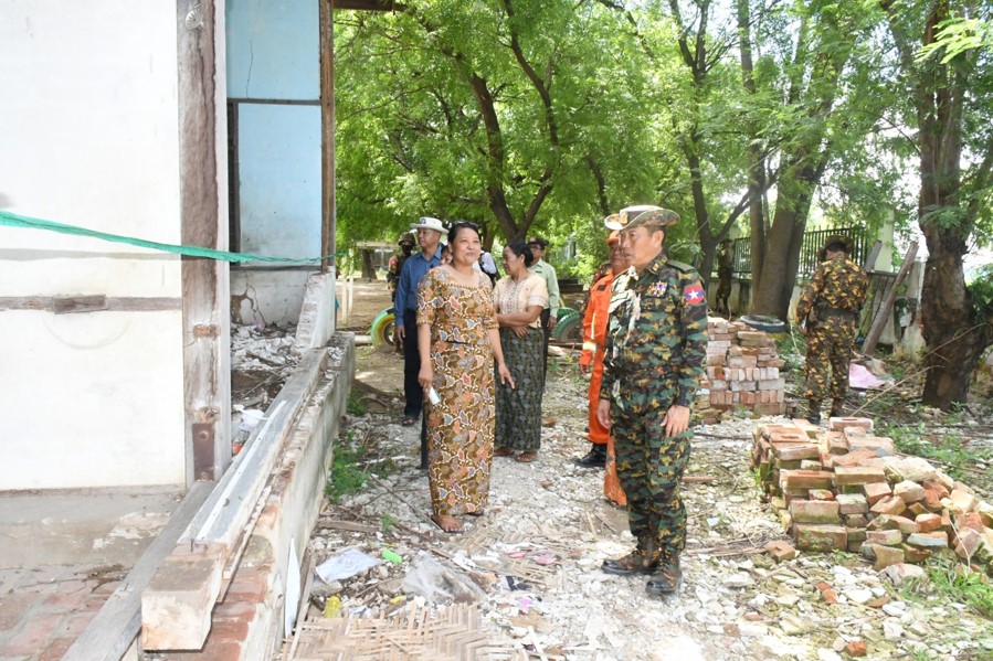ထိုသို့ ဆောင်ရွက်ပေးလျက်ရှိရာ ယနေ့တွင် ကာကွယ်ရေးဦးစီးချုပ်ရုံး(ကြည်း)မှ ဒုတိယဗိုလ်ချုပ်ကြီးသက်ပုံနှင့် တာဝန်ရှိသူများသည် စစ်ကိုင်းမြို့အတွင်းရှိ သကျမီတာသီလရှင်စာသင်တိုက်၊ သမ္ဗုဏ္ဏာရာမကျောင်းတိုက်နှင့် အခြေခံပညာအထက်တန်းကျောင်း (ခွဲ) တို့တွင် ငလျင်ဒဏ်ကြောင့် ပြိုကျပျက်စီးခဲ့သော သာသနိကအဆောက်အအုံများနှင့် စာသင်ကျောင်းဆောင်များကို လူအင်အား၊ စက်ယန္တရားအင်အားများဖြင့် အရှိန်အဟုန်မြှင့် ဖယ်ရှားရှင်းလင်းနေမှုအခြေအနေမှုတို့ကို လိုက်လံကြည့်ရှုစစ်ဆေးပြီး ငလျင်ဘေးဒဏ်သင့် ရဟန်း၊ သံဃာတော်များ၊ သီလရှင်များနှင့် လူပုဂ္ဂိုလ်များအတွက် တပ်မတော်ရေသန့်စက်ယာဉ်ဖြင့် ဧရာဝတီမြစ်ရေကို သန့်စင်၍ သန့်ရှင်းသော သောက်သုံးရေးများပေးဝေနိုင်ရေးနှင့် ပြည်သူများသောက်သုံးရေး ပြည့်ပြည့်ဝဝ ဖြန့်ဝေနိုင်ရေးတို့အား ကြပ်မတ်ဆောင်ရွက်ပေးကာ ဖယ်ရှားရှင်းလင်းပြီးသော သာသနိကအဆောက်အအုံများနှင့် ကျောင်းဆောင်အဆောက်အအုံများကို ပြန်လည်ပြုပြင်မွမ်းမံတည်ဆောက်နိုင်ရေး တာဝန်ရှိသူများနှင့် ပေါင်းစပ်ညှိနှိုင်းဆောင်ရွက်ပေးကာ လုပ်အားပေးဆောင်ရွက်နေသူများကို အချိုရည်များပေးအပ်သည်။