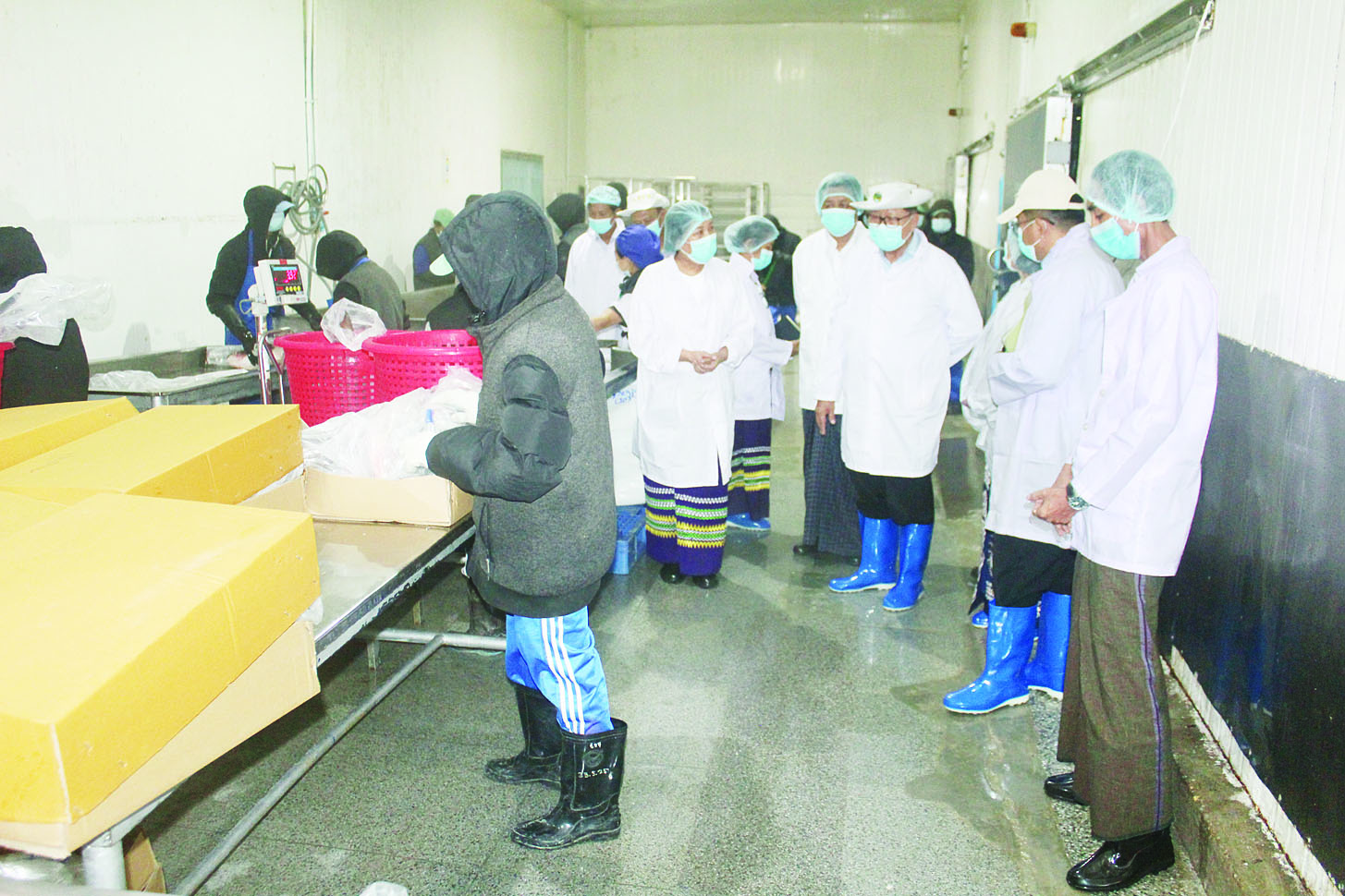 မွန်းလွဲပိုင်းတွင် ဒုတိယဝန်ကြီးသည် လှိုင်သာယာမြို့နယ် စက်မှုဇုန် (၂) ရှိ Shwe Ngar Processing and Cold Storage Plant သို့ရောက်ရှိပြီး တန် ၅၀၀ ဆံ့ အအေးခန်း စက်ရုံတည်ဆောက်၍ အပ်ကုန်လက်ခံဆောင်ရွက်နေမှု၊ အေးခဲရေချိုရေငန်ငါးများ အား UK, ITALY, Belgium, UAE, Singapore နိုင်ငံများသို့ တင်ပို့နေမှုတို့ကိုလည်းကောင်း၊ ဇုန်(၆)ရှိ GLORY ONE COMPANY LIMITED အအေးခန်းစက်ရုံတွင် နိုင်ငံတကာဈေးကွက်သို့တင်ပို့နိုင်ရန် Good Manufacturing Practices (GMP), Hazard Analysis Critical Control Points System (HACCP) စနစ် နှင့်အညီ ရေချိုရေငန် ငါး ၊ ပုစွန် များ၊ ငါးခြောက်၊ ပုစွန်ခြောက်နှင့် ဗာလချောင်ကြော်များကို ဈေး ကွက်လိုအပ်ချက်အရ ပြုပြင်ထုတ်လုပ်၍ အီရတ်၊ အာရပ်စော်ဘွားများ ပြည်ထောင်စု၊ ကာတာ၊ မလေးရှားနှင့် ဘင်္ဂလားဒေ့ရှ် စသည့်အရှေ့အလယ်ပိုင်း ဒေသနိုင်ငံများသို့ တင်ပို့နေမှု၊ MIN ZAR NI FISHERIES Co., Ltd. ၏ ငါးအသားချောင်း၊ ရေချို ရေငန် ငါးအေးခဲမှုနှင့် ငါးရှဉ့်များ ကို Korea, Taiwan, Japan, Hong Kong, China နိုင်ငံများသို့ တင်ပို့နေမှုတို့ကို ကြည့်ရှုစစ်ဆေးပြီး သက်ဆိုင်ရာနိုင်ငံများ၏ ဈေးကွက်စံနှုန်းနှင့်အညီ ပို့ကုန်တိုးမြှင့်တင်ပို့နိုင်ရေး အလေးထားဆောင်ရွက်ကြရန် တာဝန်ရှိသူများအား ဆွေးနွေးမှာကြားခဲ့ကြောင်း သိရသည်။
