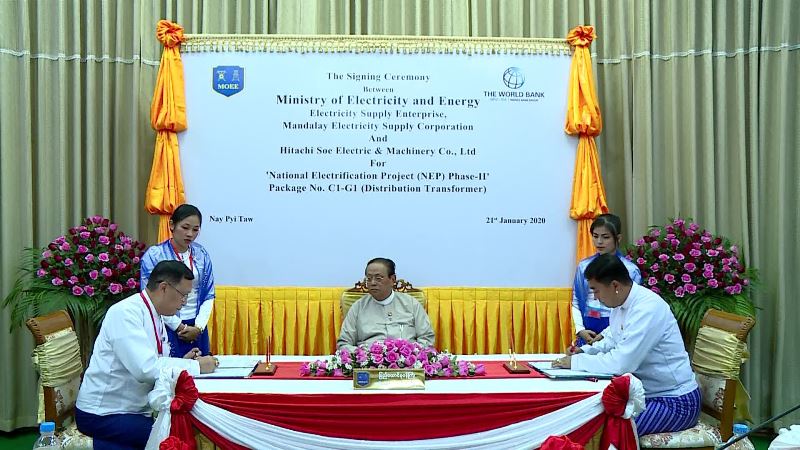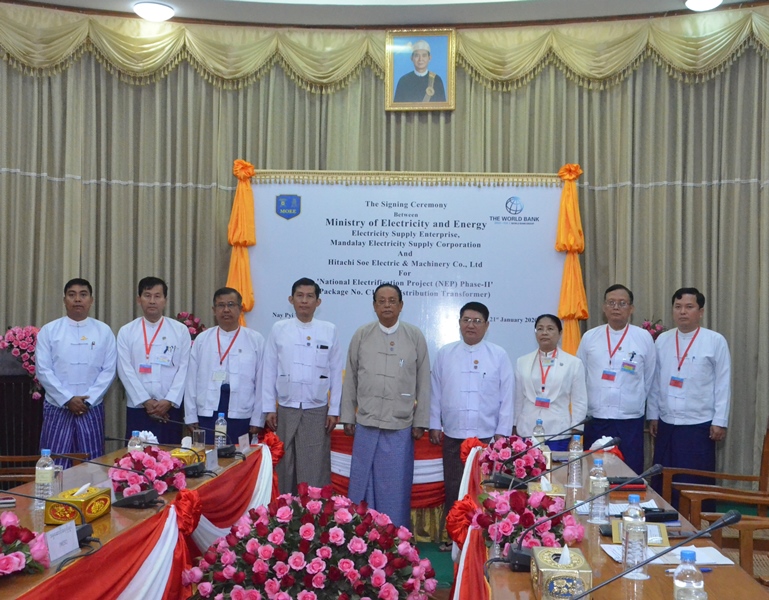 လျှပ်စစ်နှင့်စွမ်းအင်ဝန်ကြီးဌာန၏ ကမ္ဘာ့ဘဏ်ချေးငွေဖြင့်ဆောင်ရွက်လျက်ရှိသည့် အမျိုးသားလျှပ်စစ်ဓာတ်အားရရှိရေးစီမံကိန်း ဒုတိယအဆင့်ကျေးရွာများအတွက် ထရန်စဖော်မာဝယ်ယူနိုင်ရန် လျှပ်စစ်နှင့်စွမ်းအင် ဝန်ကြီး ဌာနမှ တင်ဒါအောင်မြင်ခဲ့သော Hitachi Soe Electric and Machinery Co., Ltd.တို့အကြား စာချုပ်လက်မှတ်ရေးထိုးခြင်းအခမ်းအနားကို ယနေ့ နံနက် ၁၀ နာရီခွဲက နေပြည်တော်ရှိ လျှပ်စစ်နှင့်စွမ်းအင်ဝန်ကြီးဌာန ဝန်ကြီးရုံး အစည်းအဝေး ခန်းမ၌ ကျင်းပသည်။