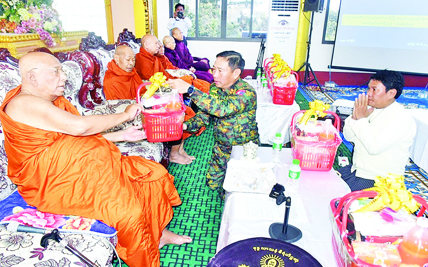 စစ်ကိုင်းတိုင်းဒေသကြီး စစ်ကိုင်းမြို့ ပန်းပဲတန်းရပ်ကွက်ရှိ ငလျင်ဒဏ်ကြောင့် ထိခိုက်ပျက်စီးခဲ့သော ရတနာစေတီဆင်များရှင်စေတီတော်မြတ်ကြီး ဘက်စုံပြုပြင်မွမ်းမံခြင်းလုပ်ငန်းနှင့် ပတ်သက်၍ လုပ်ငန်းကိစ္စများ ရှင်းလင်းလျှောက်ထားခြင်းနှင့် ဩဝါဒခံယူခြင်း အခမ်းအနားကို ယနေ့နံနက်ပိုင်းတွင် အဆိုပါစေတီတော်ကြီး၏ ပရိဝုဏ်အတွင်း၌ ကျင်းပပြုလုပ်ရာ နိုင်ငံတော်ဩဝါဒါစရိယ၊ ရွှေကျင်နိကာယဥက္ကဋ္ဌ သောဠသမရွှေကျင်သာသနာပိုင် သီတဂူကမ္ဘာ့ဗုဒ္ဓတက္ကသိုလ်များနှင့် သီတဂူဆေးရုံတော်များ၏ အဓိပတိအဘိဓဇမဟာရဋ္ဌဂုရု အဘိဓဇ အဂ္ဂမဟာ သဒ္ဓမ္မဇောတိက မဟာဓမ္မကထိက ဗဟုဇနဟိတဓရသီတဂူဆရာတော်ကြီး ဒေါက်တာ ဘဒ္ဒန္တဉာဏိဿရအမှူးပြုသော သံဃာတော်များ ကြွရောက်တော်မူကြပြီး ကာကွယ်ရေးဦးစီးရုံးချုပ် (ကြည်း) မှ ဒုတိယဗိုလ်ချုပ်ကြီး သက်ပုံ၊ စစ်ကိုင်းတိုင်းဒေသကြီးအစိုးရအဖွဲ့ဝင်များ၊ ခရိုင်/ မြို့နယ်အဆင့် ဌာနဆိုင်ရာဝန်ထမ်းများ၊ ဂေါပကအဖွဲ့ဝင်များ၊ မြို့မိမြို့ဖများနှင့် တာဝန်ရှိသူများ တက်ရောက်ကြသည်။